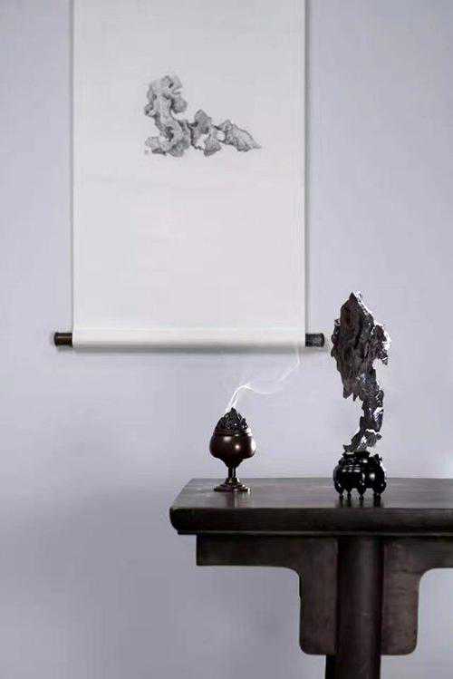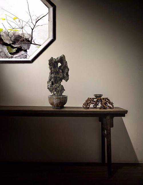 宽敞明亮的房间,古色古香的装饰,清雅幽静的氛围;博古架、古家具、菖蒲、青苔、书画、香炉……一个都不少。在如此环境之中,置几方小石,该是何等高雅、惬意?身临此境,身心都已被震撼,谁还会在意石之优劣?试想环境布置的如此有品位,其中的石头怎么会差呢?殊不知赏石水平的高低跟财富并不成正比,千万不要被环境所迷惑,而忘了用心去分辨。