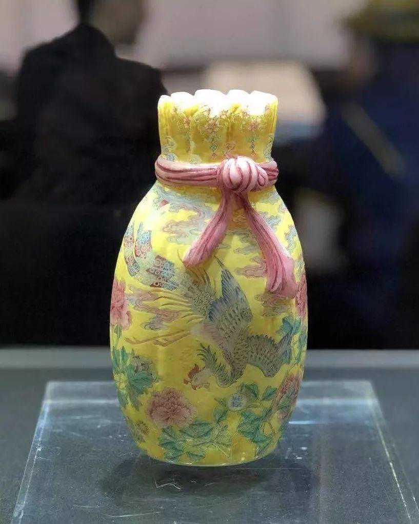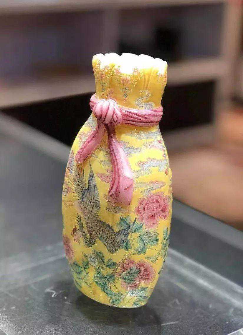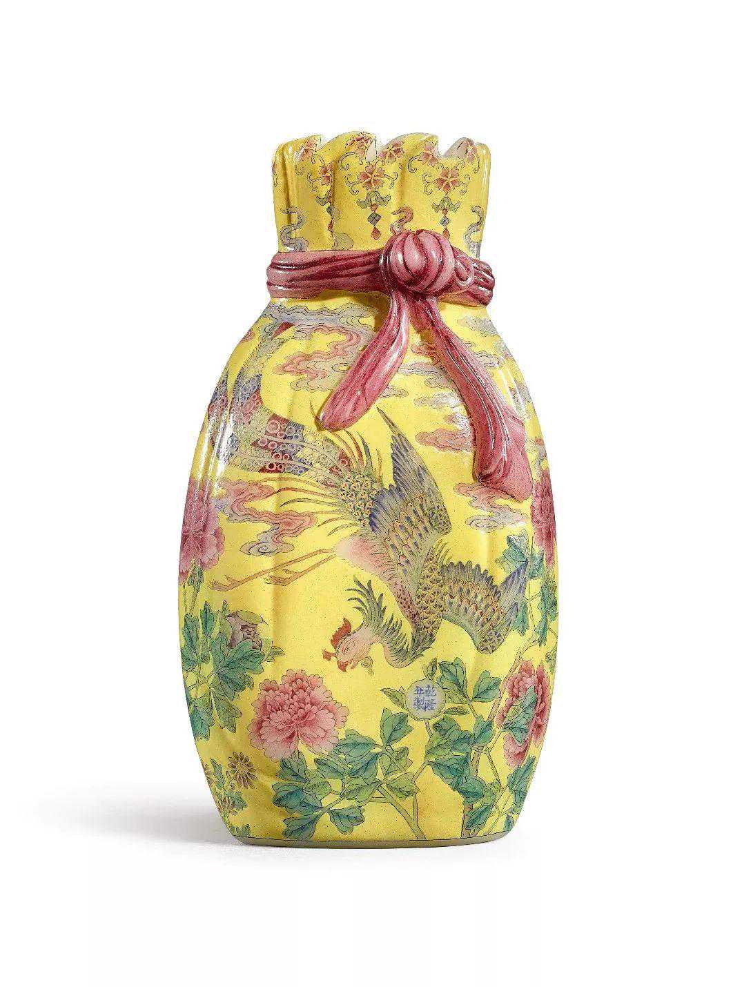 清乾隆料胎黄地画珐琅凤舞牡丹包袱瓶