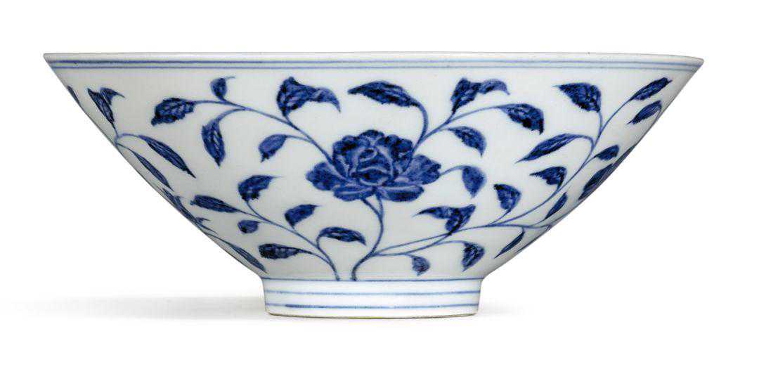 此碗堪称永乐御窑制瓷至臻典范。其器形隽秀蕴藉,青花曼妙动人,柔瓣散舒,幽芳怒绽,突显出纯朴和谐的中国美学。纵观历代瓷器的花卉纹饰,月季纹实为稀有,若非其内层花瓣旋卷而发,难以肯定此乃月季。