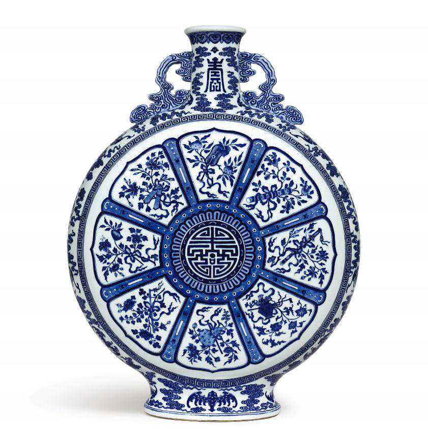 端丽大器、华贵雍容,气势非凡,为乾隆御窑登峰造极之作,目前仅见另外两例传世,珍稀罕有。其整体以“寿”字为轴,与他类扁壶迥异,可能为特殊节庆所造,观其纹饰内涵,应为万寿节之庆贺大礼。