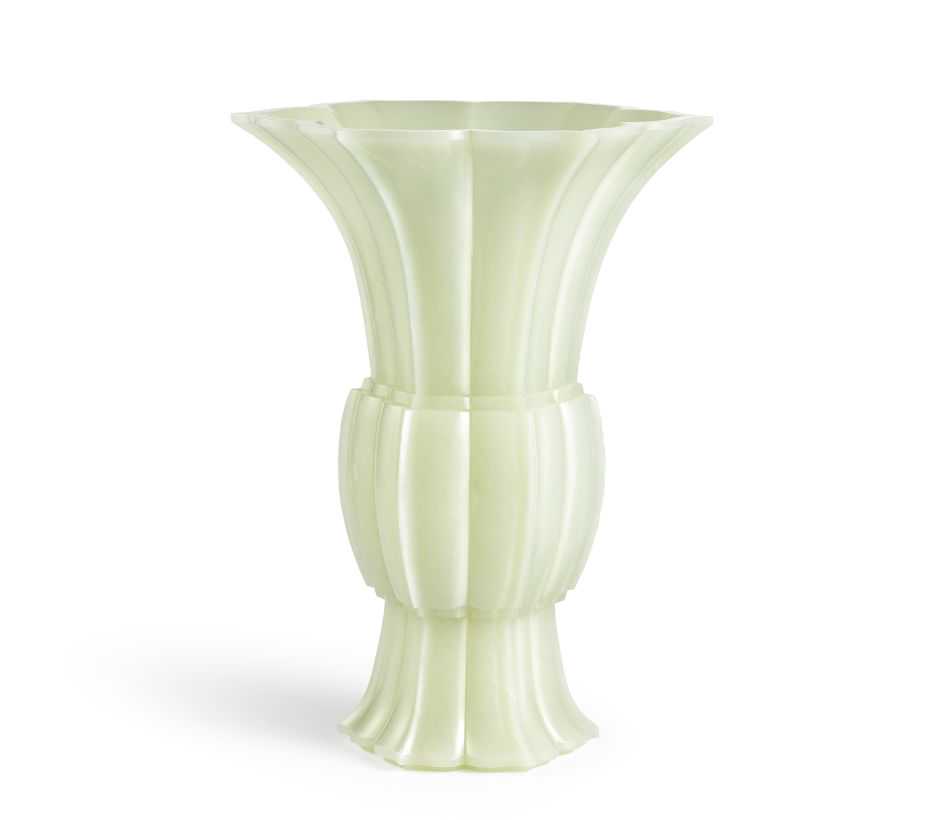 觚采花式,敞口、撇足,觚腹微隆,流畅利落。其风格拟古而藏新思,迎合乾隆皇帝喜好,是同类玉器的典例。此器形从高古青铜觚获取灵感,复古形制,取其线条优美。从上方俯瞰,宛如盛开花朵,含蓄静穆。