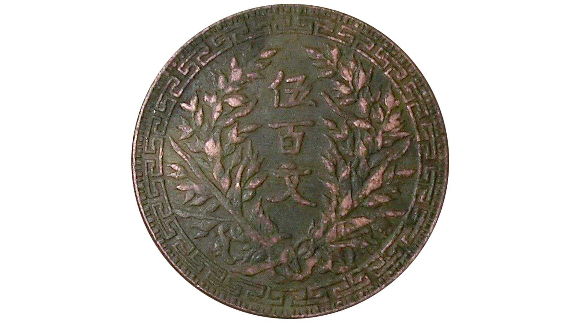 中华民国双旗嘉禾伍佰文约1931年铸造。是中国铜元最大者,系试铸样币,存世一枚。
