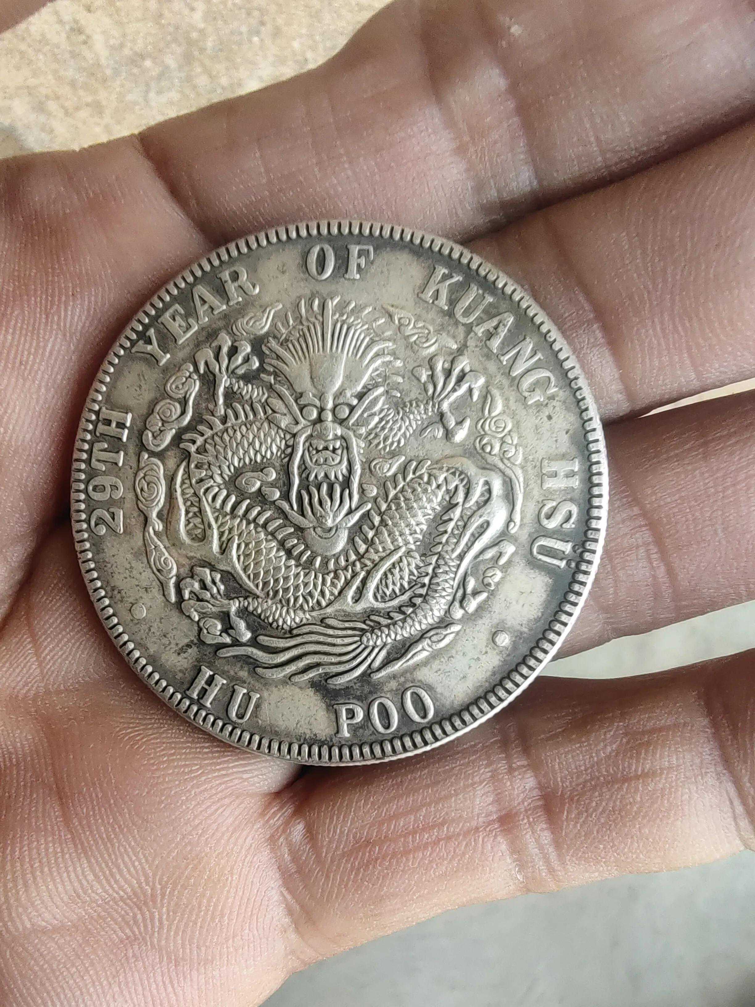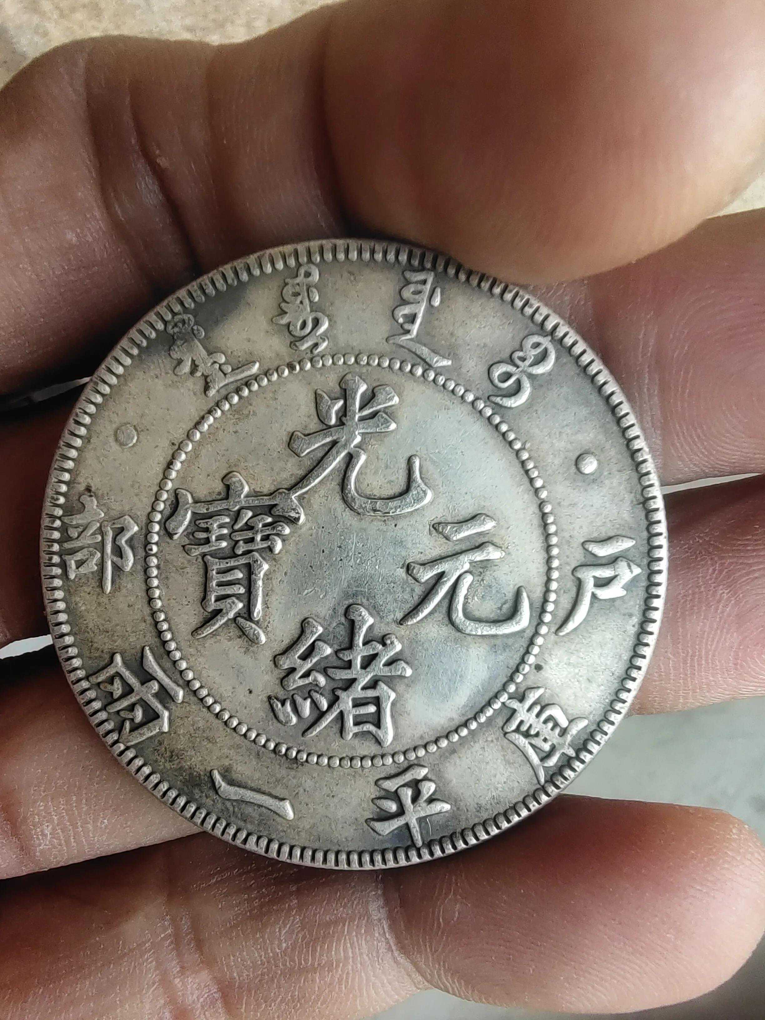 大清光绪29年(1903年),户部铸造了一枚以"两"制的银币,俗称“户部一两"。由于朝庭的“圆两”之爭,虽有铸造一两银币,但实际流通的少。名列中国“龙銀大珍”之首的“奉天省造癸卯库平银一两"是两银争议的产物。清光绪29年至34年期间,除户部外,多地方也效仿铸造一两银币。例如:“甘肃省造乙已一两"、“新疆省造库平重一两”等等。户部“光绪元宝库平一两"(‘两’字为‘入’两),银币:直经为43毫米,重36.+克。正面珠圈内镌“光绪元宝”,上为满文四字,下镌“库平一两"(‘入’两),左右分别镌“户″、“部",上各有一凸圆点;背面为蟠龙图(标准图),外缘內镌英文大写“29THYEAROFKUANGHSU”,U字上加二点,下镌英文大写“HUPOO”,左右各一凸圆点。设计简朴大气,龙头向上,龙眼凸出,龙爪在龙头左右,龙尾在下,龙须长短不一,为八须,另加以祥云相衬托,龙鳞饱满,颗颗可见,英文“HU”上似有一小爪,直齿边。地方各省造“库平一两”则不照“户部”的标谁铸造。故被称作臆造币,例如:“甘肃省造乙已一两”,背龙图则不一样,其实设计风格也不错,富有创意。本文图片系个人藏品,以物论物,反对侵权。