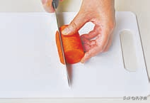 胡萝卜切成长段,先在侧边横切下一小片。(因为圆柱形容易打滑,切出一
