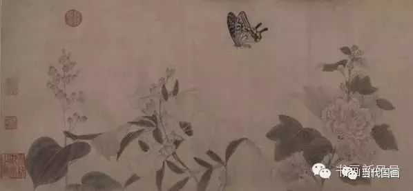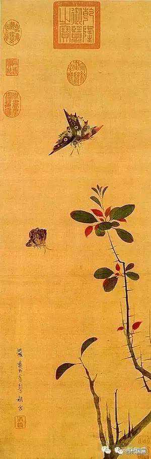 两宋时期,出现了众多描绘蝴蝶的作品:宋徽宗赵佶的《芙蓉锦鸡图》中,两只小小的蛱蝶,虽非主角,但是在整个画面中起到了不可忽视的连接点缀作用。