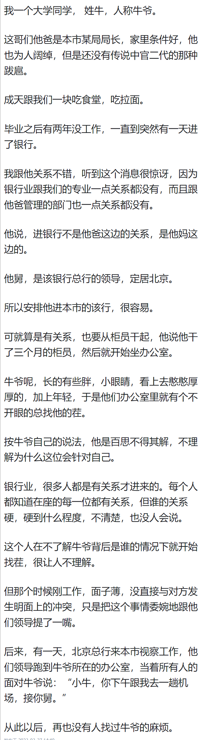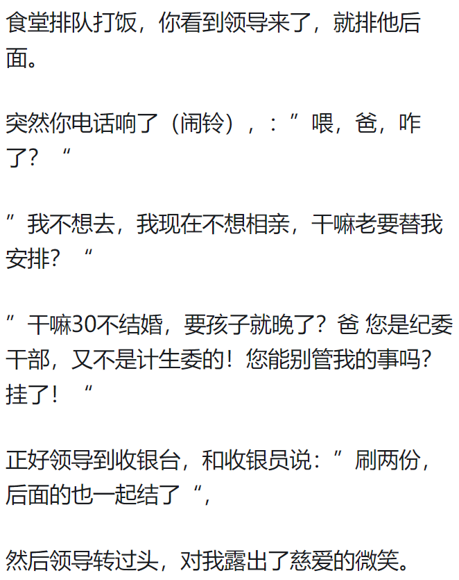 食堂排队打饭,你看到领导来了,就排他后面。突然你电话响了:”爸,你去纪委工作了?“然后你领导转过头,对你露出了另一个爹的微笑