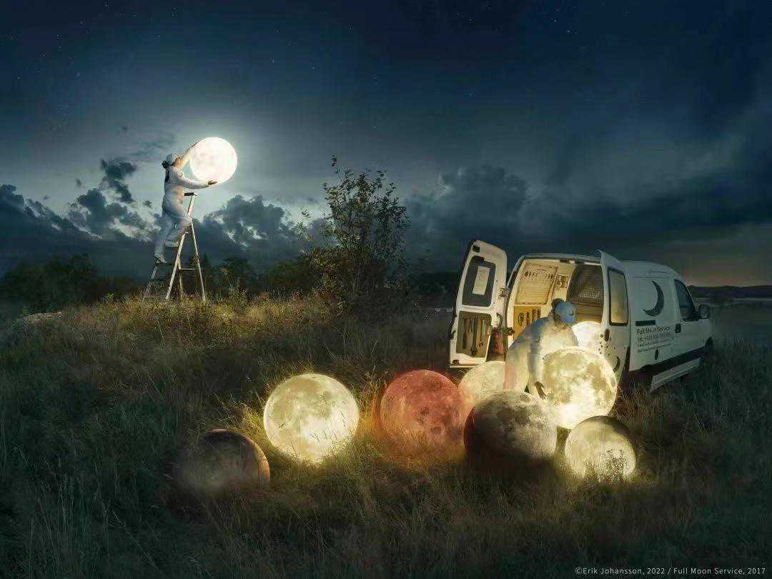 艺术家为中国首展甄选了80幅代表性超现实主义艺术作品,其中大部分以摄影和后期技术为创作手段,构建出奇幻的创意视觉。比如拥抱着巨大月亮的专门为人们提供圆月服务的工作人员、办公室里抱着纸飞机企图出逃的白领、剪裁云朵的人……约翰逊的作品诙谐幽默,包含着对于现实的批判与挑战意味——“我的灵感来自于周围常见的事物与‘要是……会怎样’的想法”。在约翰逊看来,所有作品从一定程度上都是他的“肖像画”,反映了他的生活、想法、计划,创造了真实世界里并不存在的风景。