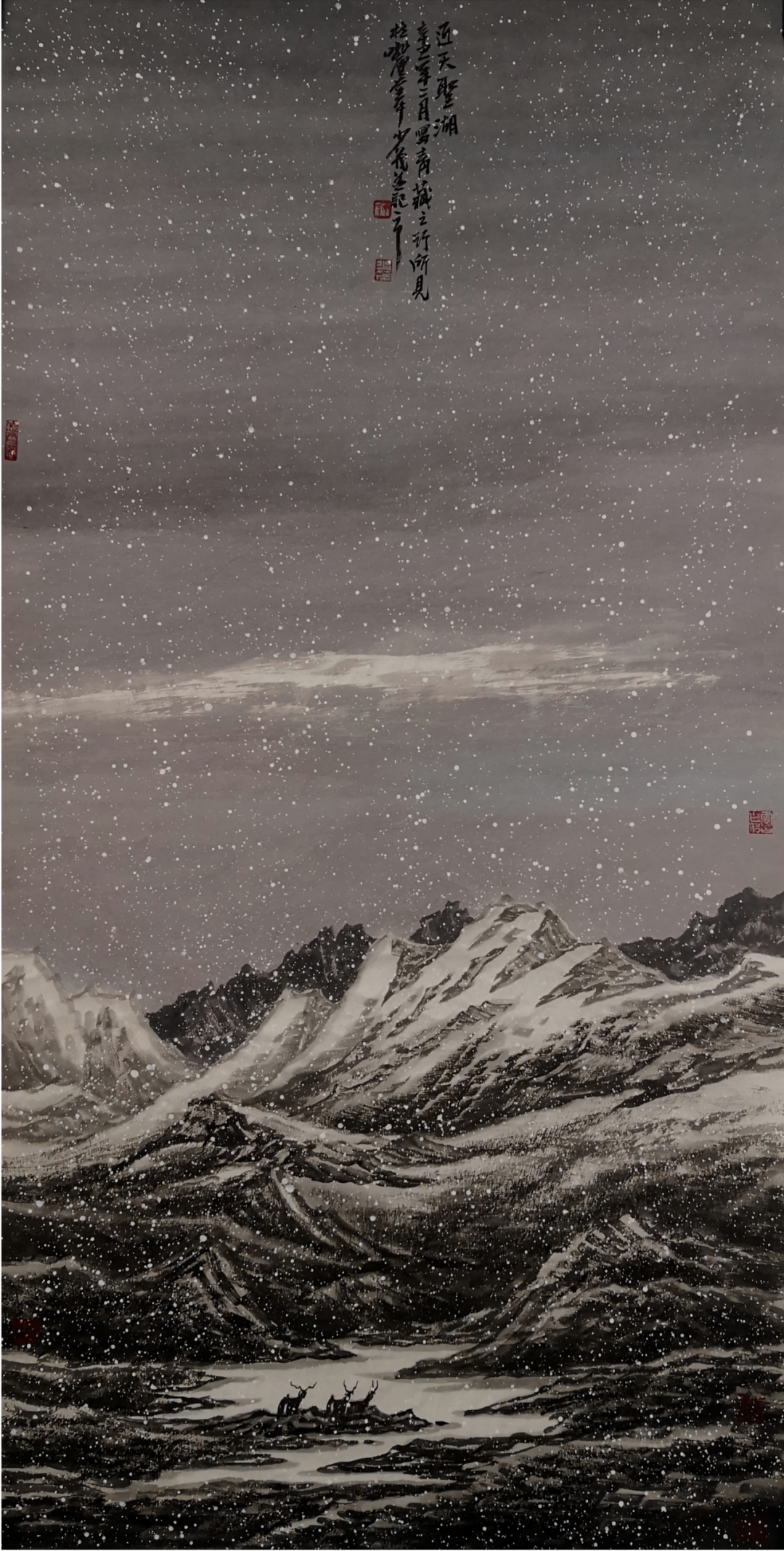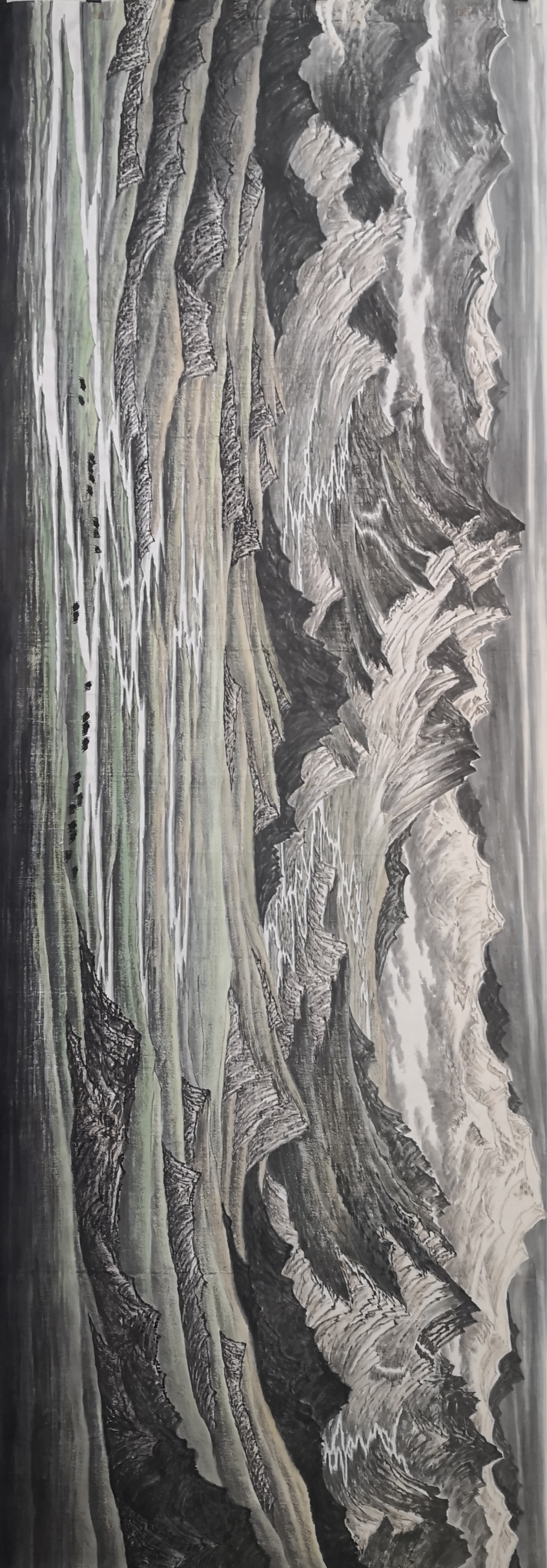 一般而言,观念的不同,导致笔法与山水结体之间产生变异。但包少茂的山水实践,并非观念先行,他一开始就摆脱了前辈画家背负的以历史为主体的人文精神,从笔墨语言的尝试和探索中,提炼出符合自己生命底色的山水信仰:包少茂从小生活在著名的当归之乡——岷县的大山深处,在那里,岷山尽管驰名天下,高不可攀,却长期笼罩在贫寒之中,一种巨大的力量在这种反差中产生。当他走出大山之后,这种感受和经验就更加突出了,“岷山”成就了他最初的绘画,又矗立在记忆和视觉的尽头,成为永远的指引——至大至刚,崇高而又圣洁。由此出发,构成了包少茂西部山水画的精神谱系。