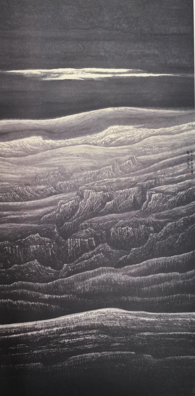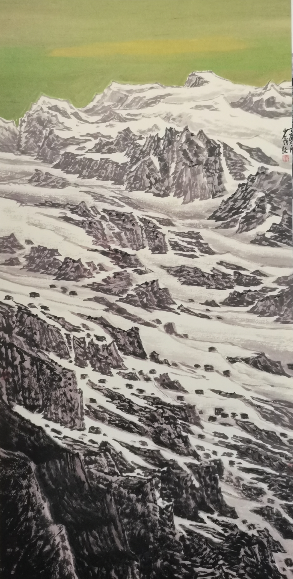 开启西部山水画的三重境界在本土山水画家中,郭文涛和陈天铀的形式风格,或豪迈或沉雄,复活了回荡在西部自然中的金戈铁马之声,这种类似边塞诗风的精神气概,既与西部自然的结构形态和宏大气势相颉颃,也应和了改革开放、高歌猛进的时代氛围,具有强悍的视觉冲击力,为世人所认可和熟知。创作之初,包少茂受其影响和吸引是必然的,所以才有机缘拜陈天铀为师。