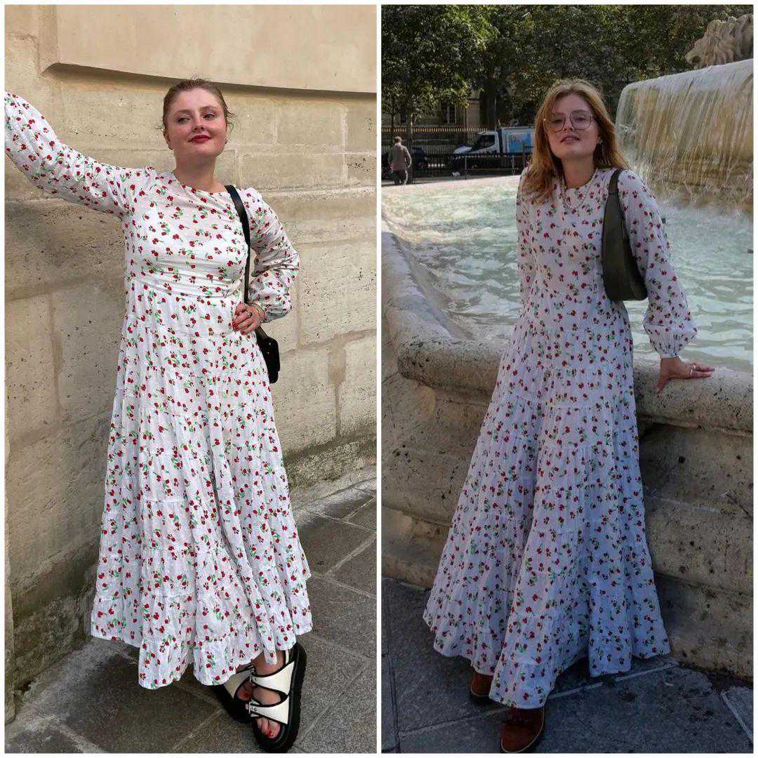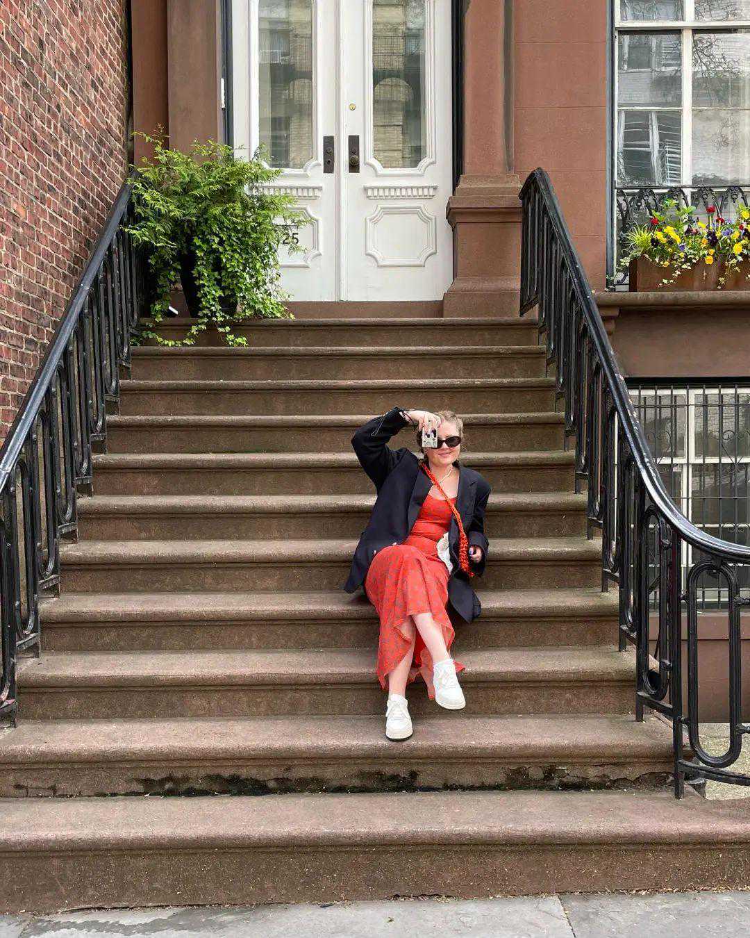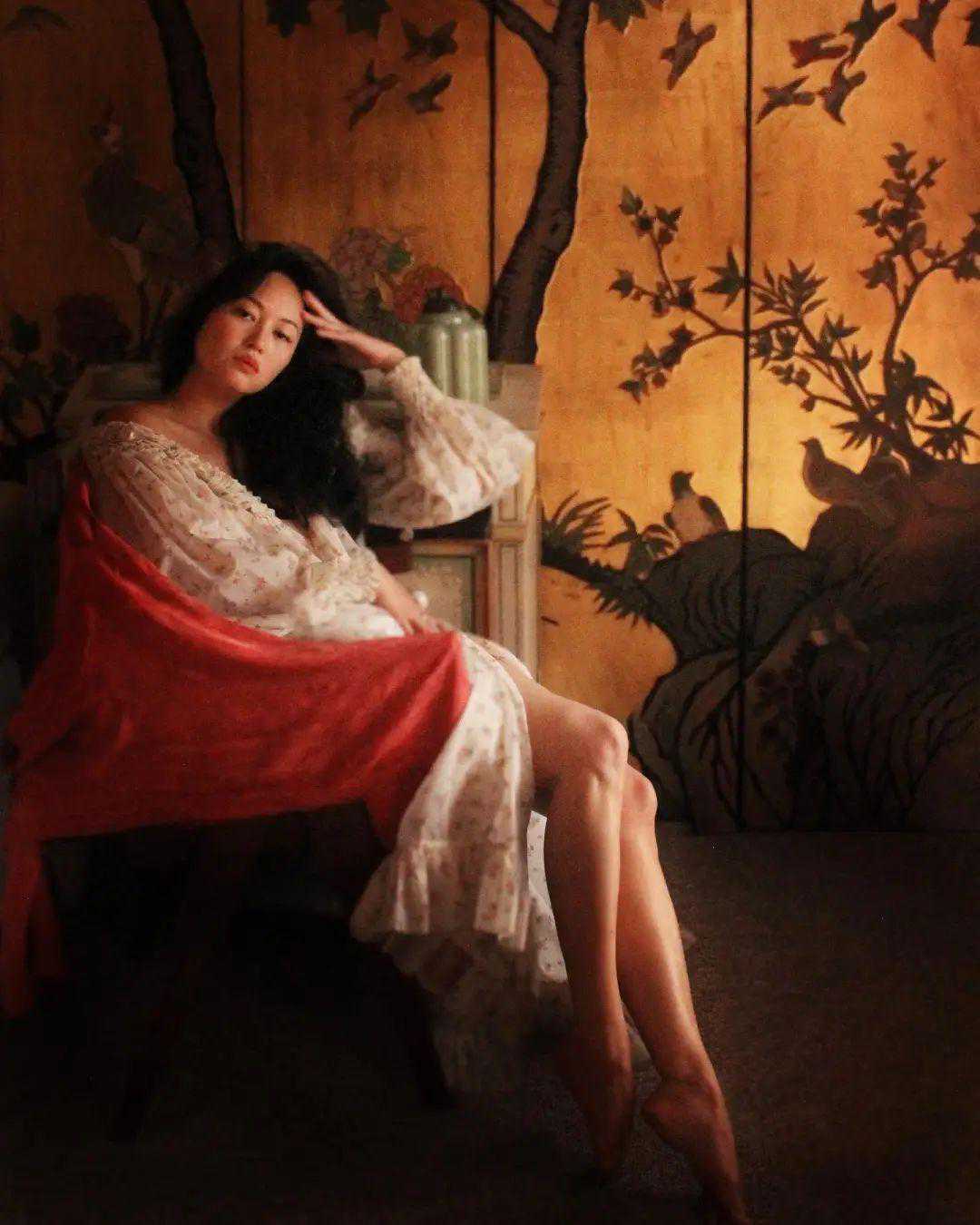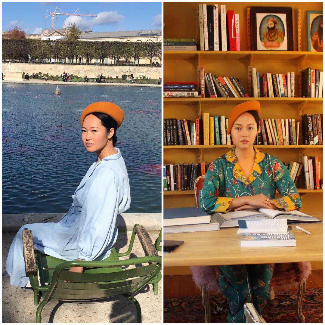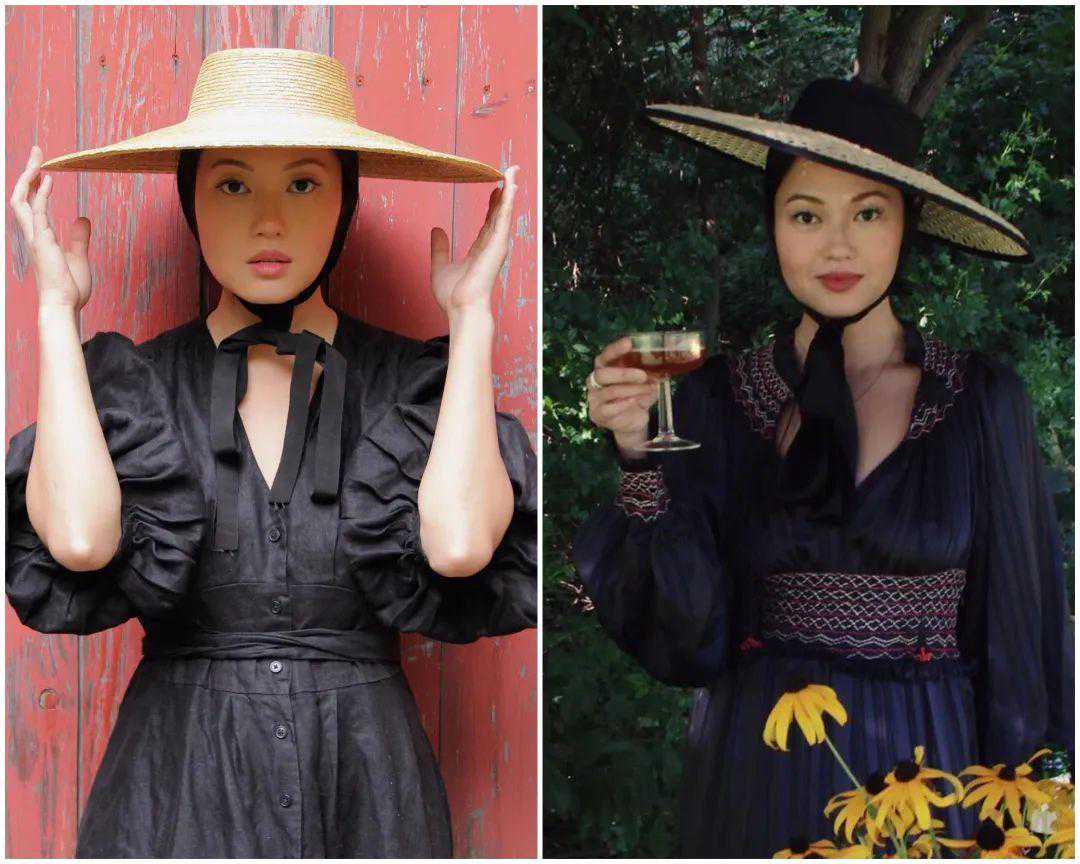 这件连衣裙她用两种方式打开过。右边加了眼镜,换掉了包包、鞋子,光线和背景也更有氛围。▼