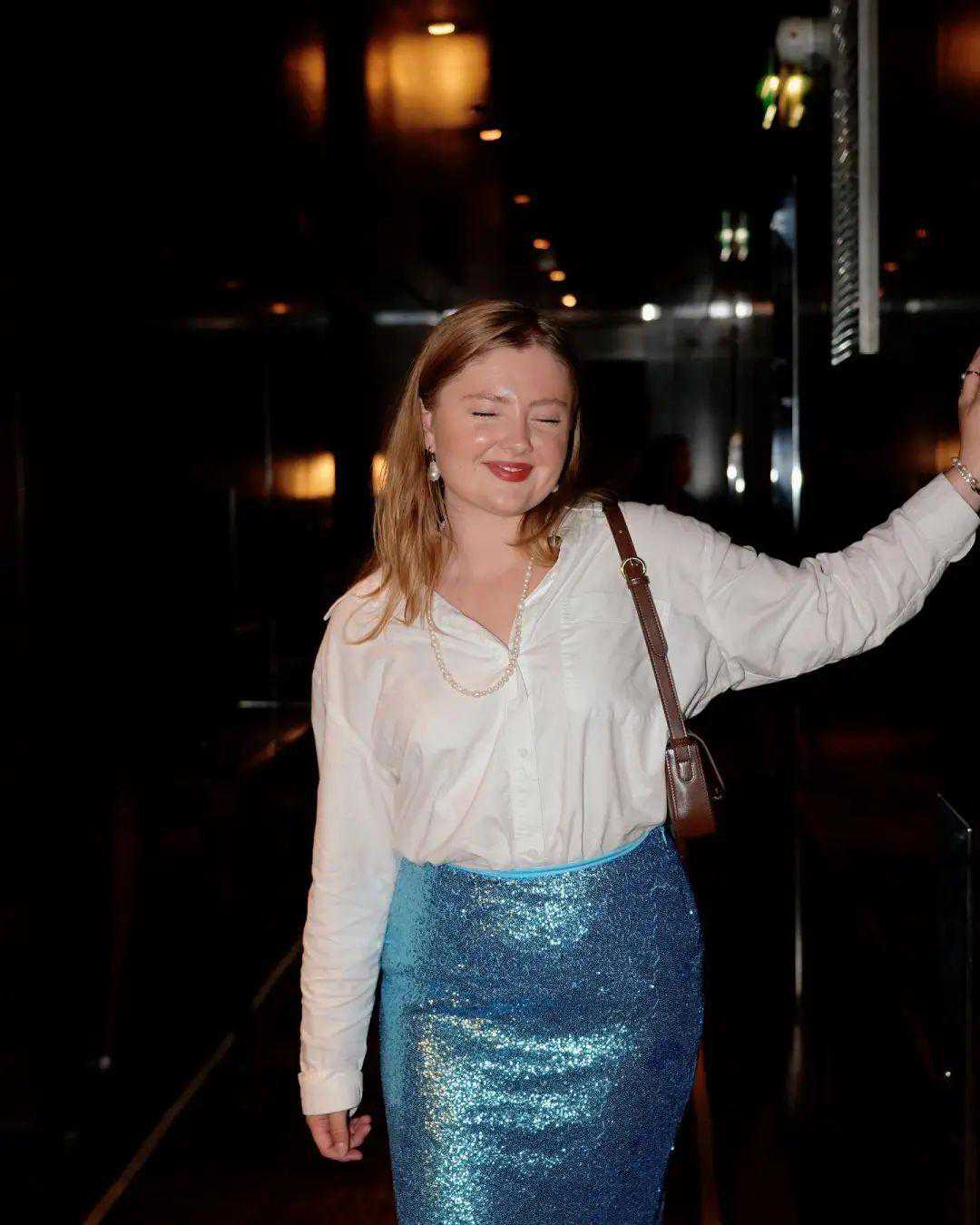 圆润的珍珠首饰也特别衬她,有光泽的美~发现没,她真的挺敢穿的,穿上这条闪闪小蓝裙,好像一条美人鱼🧜♀️~▼