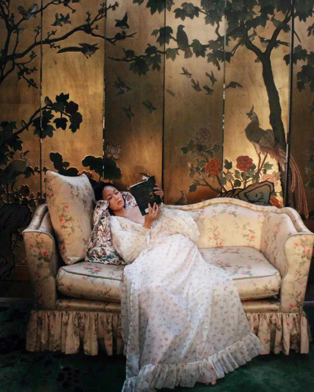 她爱穿的各种裙子,在颜色上也特别有油画氛围,丝绒粉、莫兰迪绿完美融入家里的沙发、绿墙。▼
