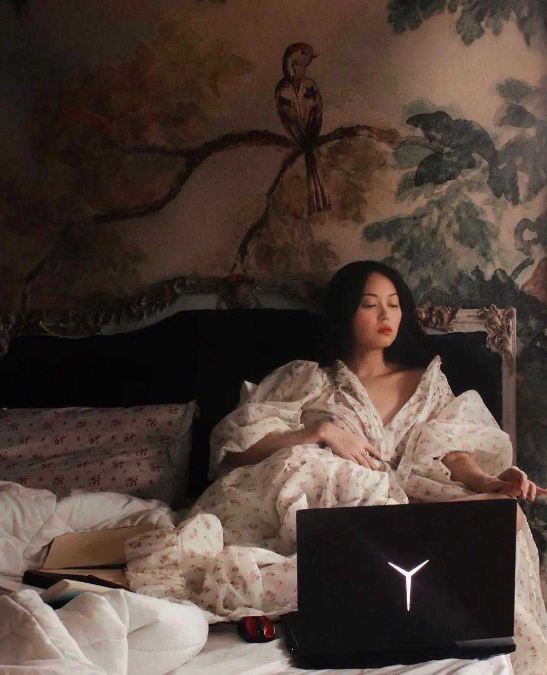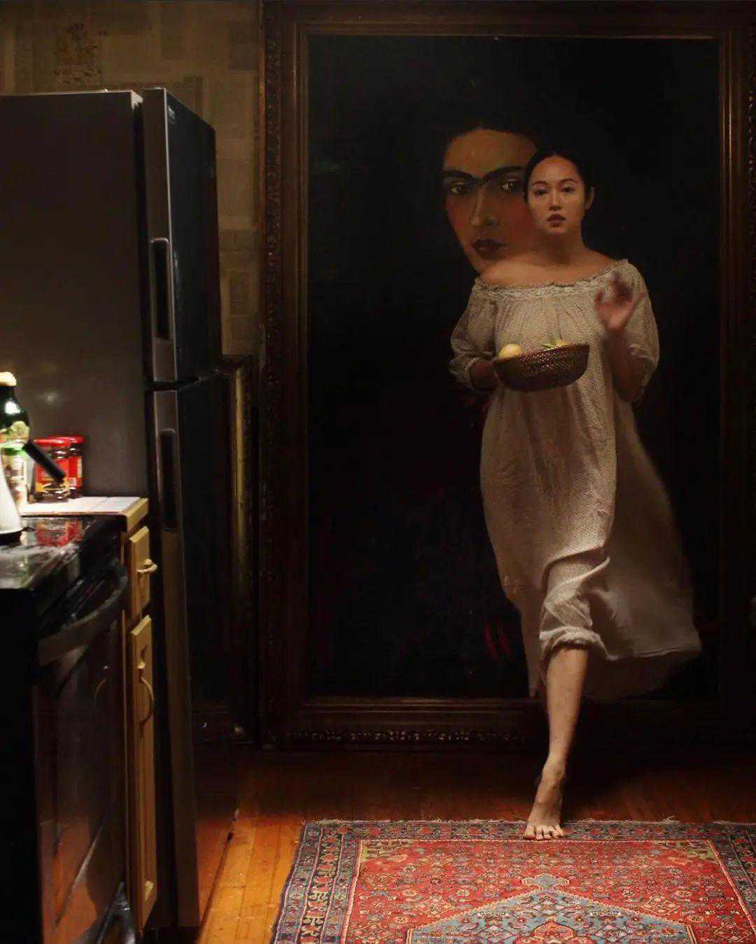 Victoria出生于缅甸,生活在美国,现在是一位室内设计师,也是两个孩子的妈妈。她在空闲时间很喜欢拍摄“自画像”,喏,就是这种复古油画风的照片,很像中世纪的自画像。