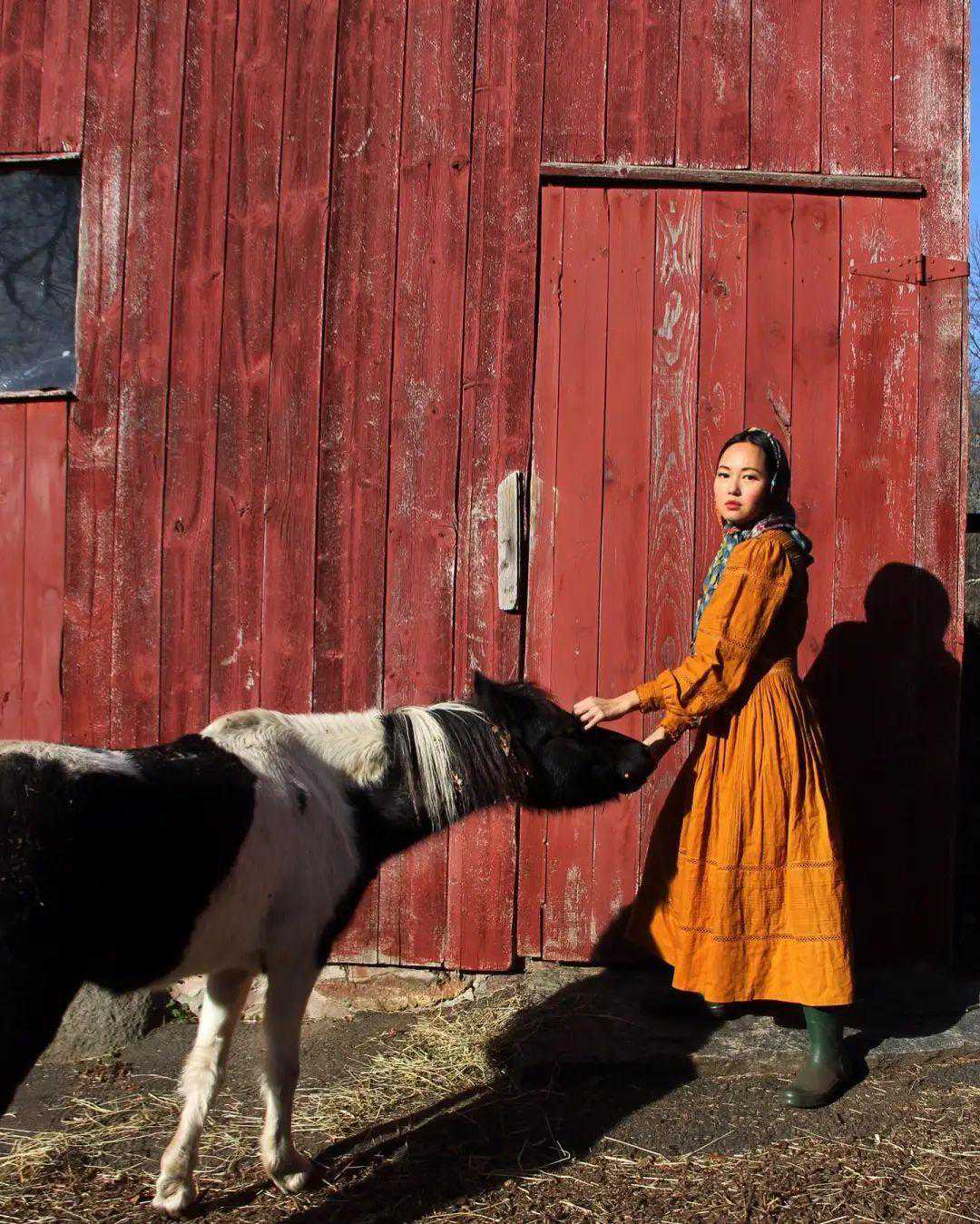 也经常会用到头巾,搭配时选择同色系,也很有复古田园风的味道。▼
