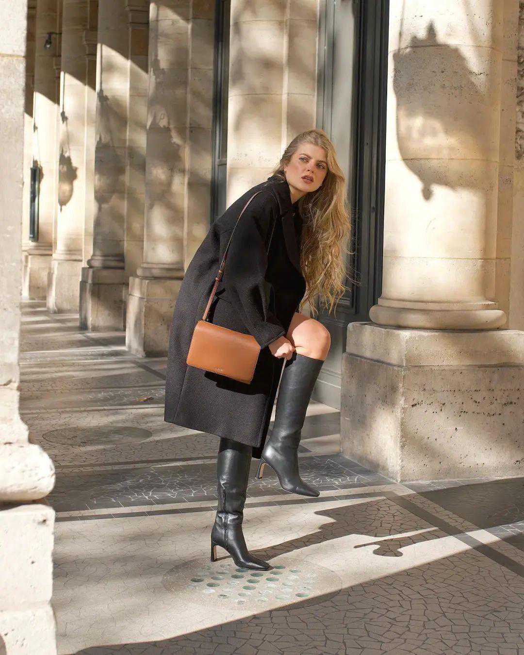 选对靴子很重要:她的长靴都带点跟,显得挺拔。鞋型秀气,靴筒比较贴合小腿弧度,不会破坏腿部线条。
