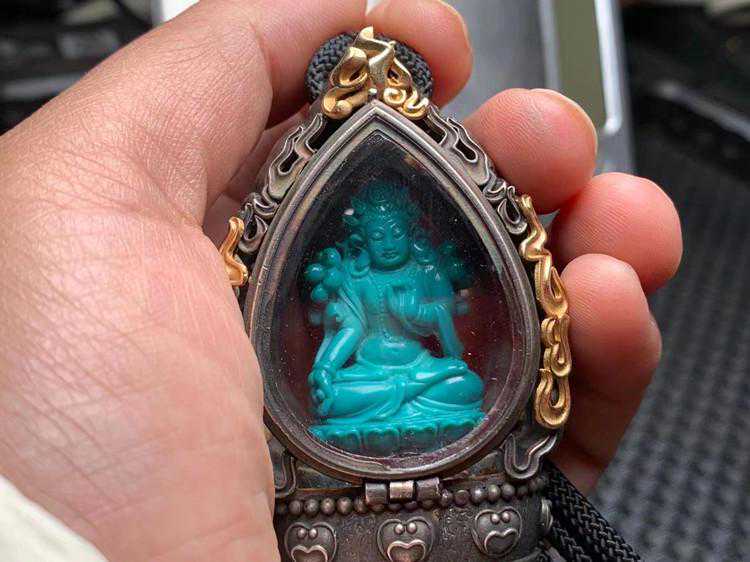 其实这样的绿松石寸佛嘎乌盒造价也是不低的,抛开外面的嘎乌盒不说,这种雕刻寸佛的绿松石品质,颜色,瓷度都是要求相当高的,最贵的还是它的雕工,由于非常的小,雕刻起来费时费力,据雕刻师傅说,绿松石寸佛的雕刻比普通的绿松石雕刻件难度有过之而无不及