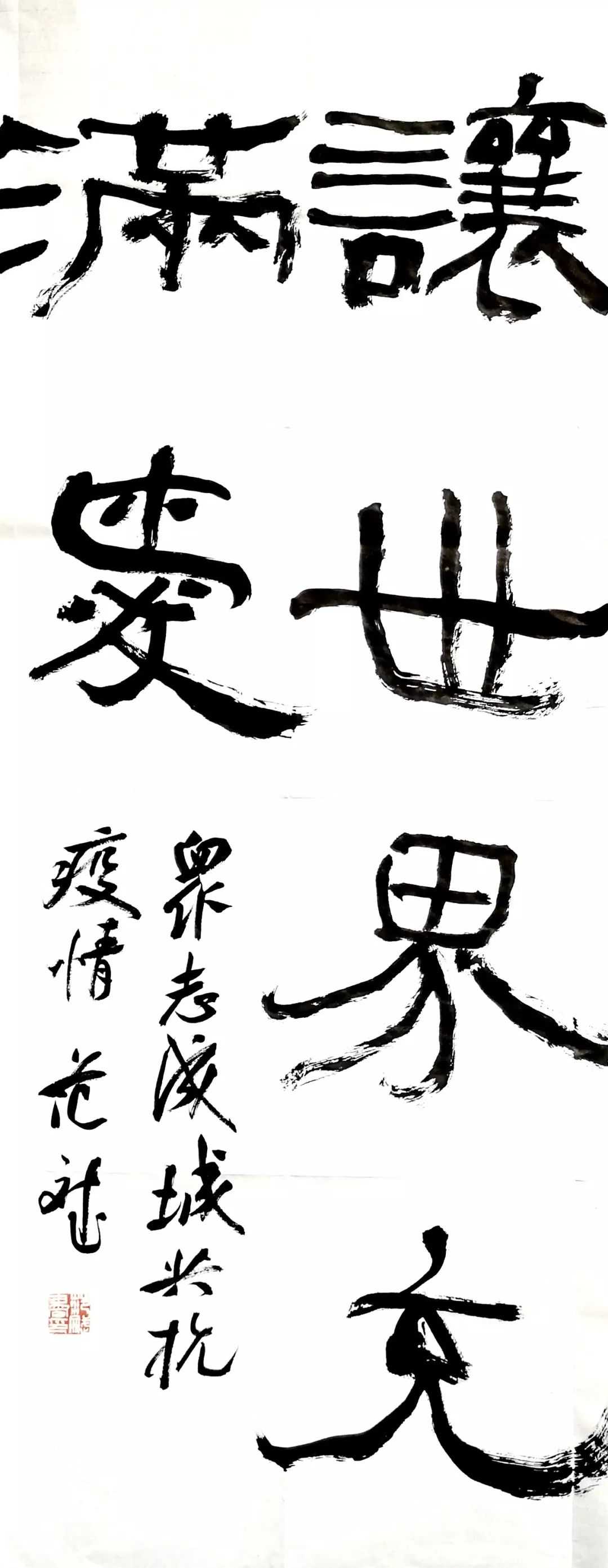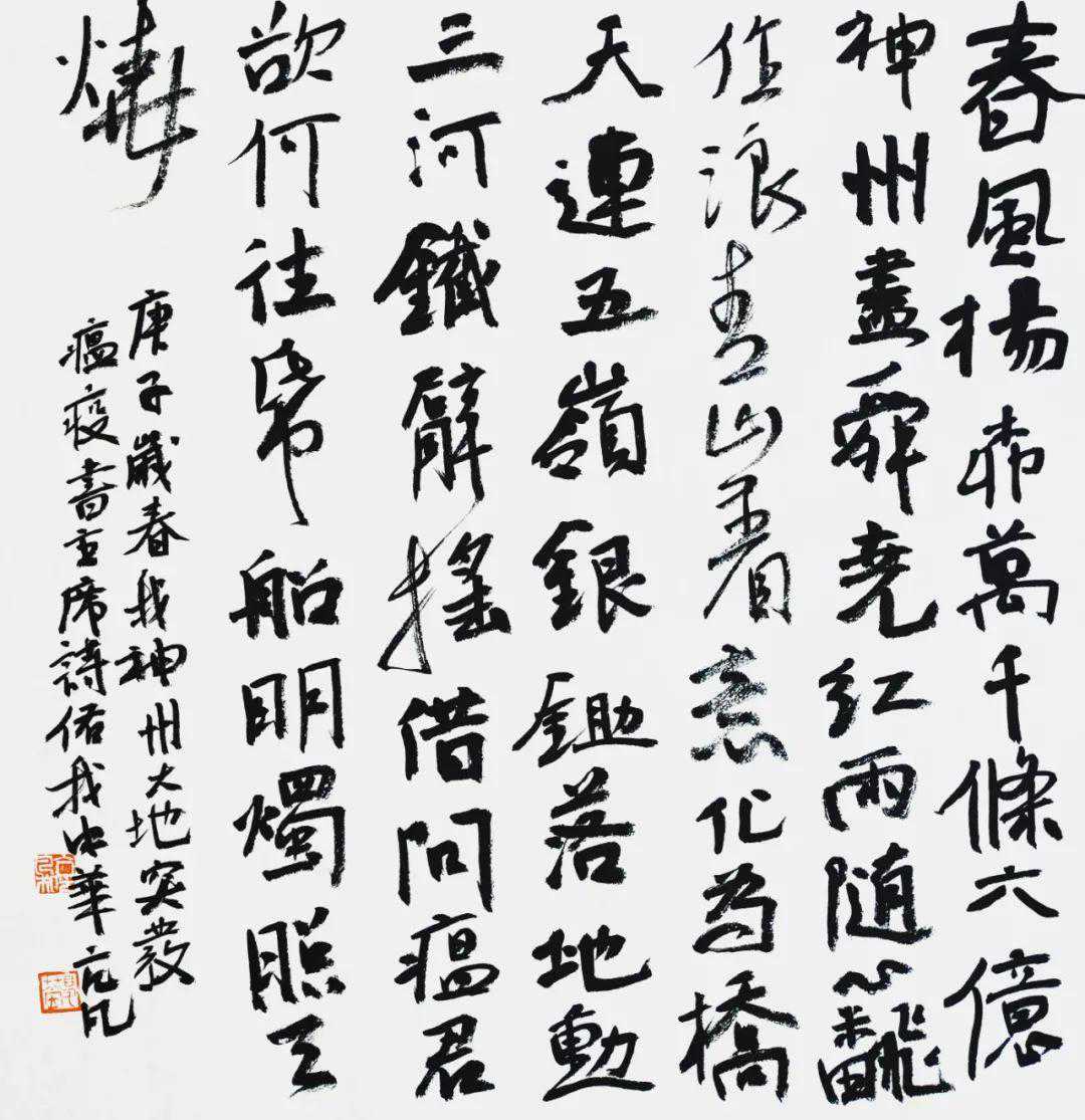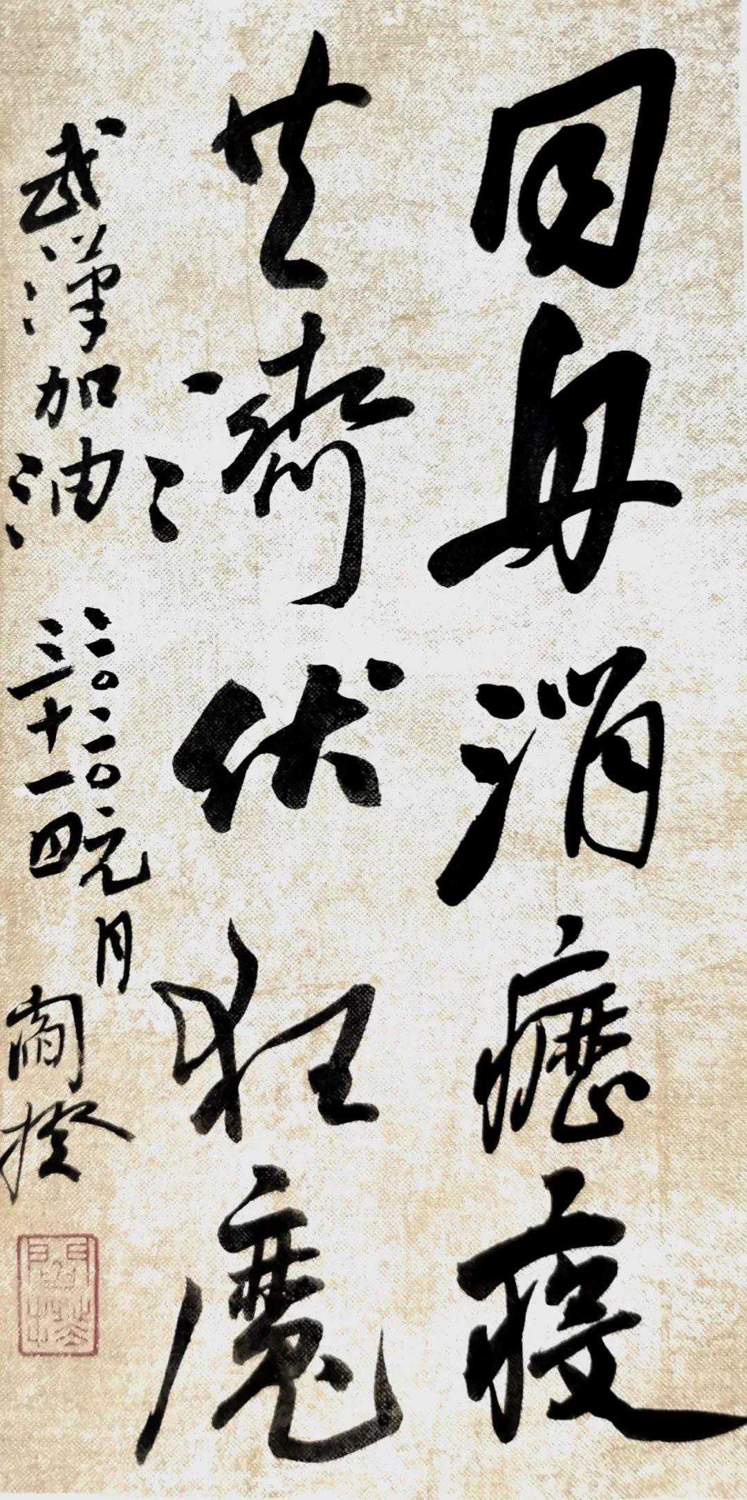 我们书法同仁,亦寝食难安。今天,全国各地荣获过兰亭奖、全国届展、大展的书法名家、精英共一百多人,以我们的双手,用爱研墨,以心为纸,奋笔疾书,点画浓淡间,化作对江城武汉的祈福、对中国大地的祝愿。我们坚信,在党和政府的坚强领导下,在全国各族人民共同努力下,江城武汉、湖北省、中国大地……一定能取得抗击疫情的伟大胜利!