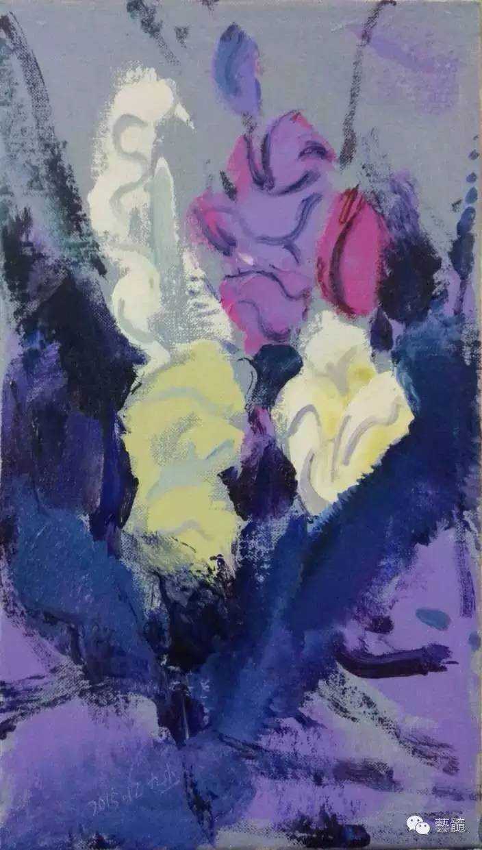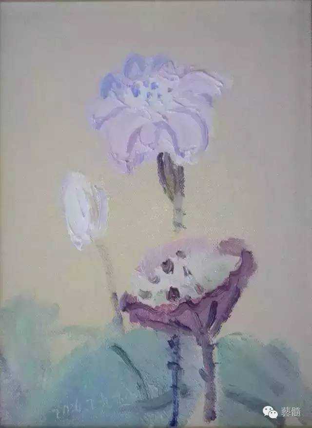 九杰的莲花,以黄紫作为主色系,穿插纯度很高的蓝、品红,画面的调子控制的高贵而显得恬静,灰紫色的背景可能代表着九杰抑郁且挣扎且沉静同时且黑暗的心灵背景,上面闲开一朵莲花,莲花的造型随意而恰切,那些叶脉是真的写出来的。而且画面也呈现着仿佛一次成像的书写性,这一层书写是不着痕迹的,或者说他已经做到了不露痕迹。