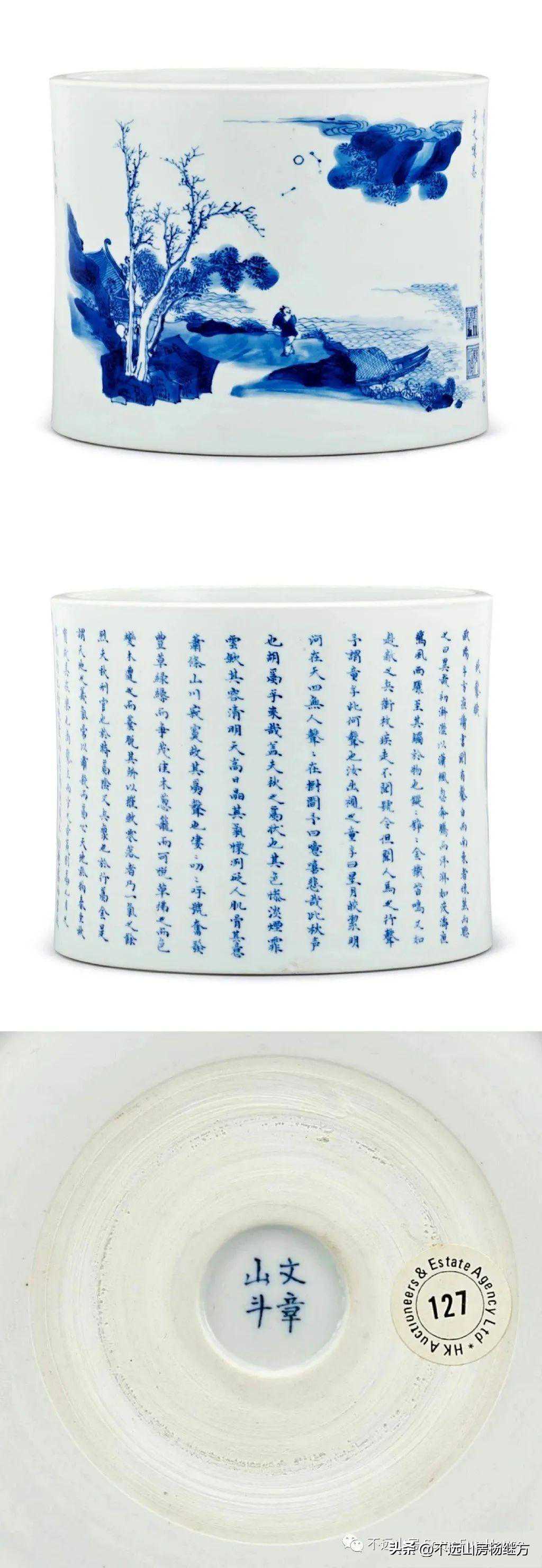 香港苏富比2021春博古五千专场的康熙青花文章山斗款秋声赋图笔筒