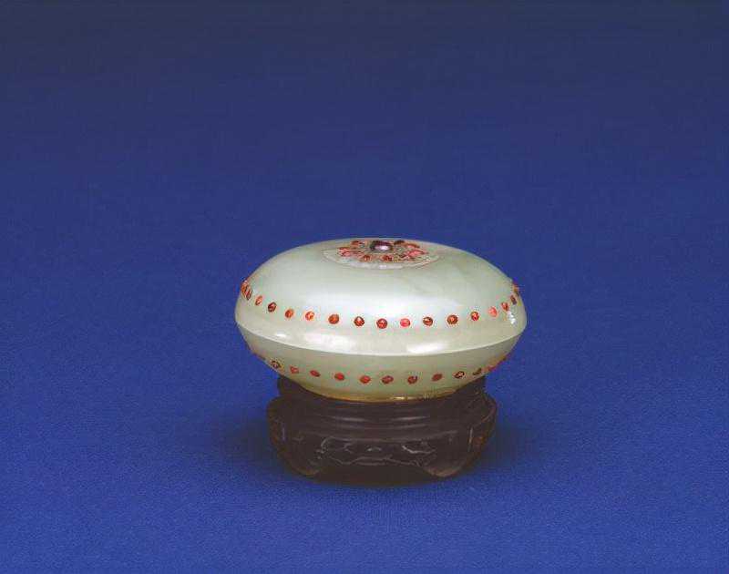 此盒造型简洁,完全不见清代玉器纹饰的繁缛之风,而金镶宝石盖又艳丽华贵,对比强烈,因而具有特别的艺术神韵。此盒的用途未见记录,从器形上分析,为文房用具或闺房用品的可能性较大。