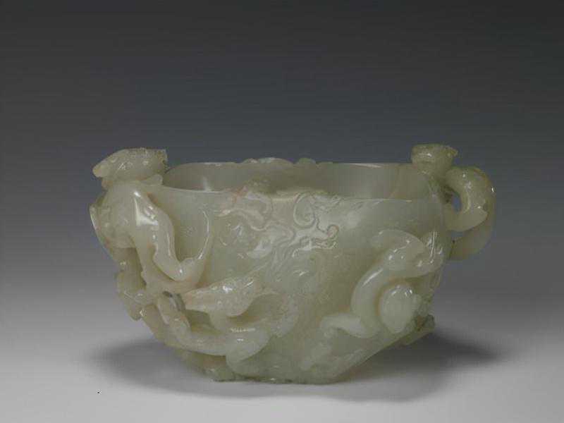 白玉龙凤云螭纹杯,清,通长13.3cm,最宽9cm,通高7.2cm。