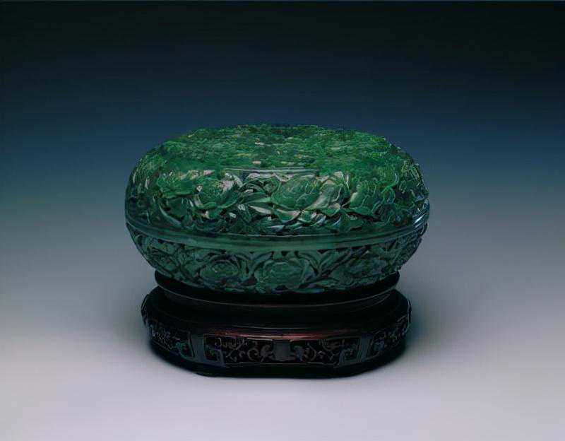 碧玉镂雕牡丹纹盒,清,通高9.1cm,最大口径20.4cm。