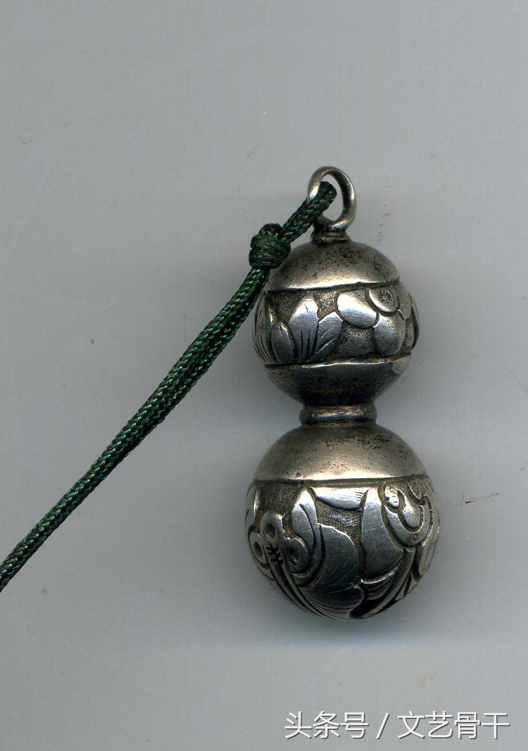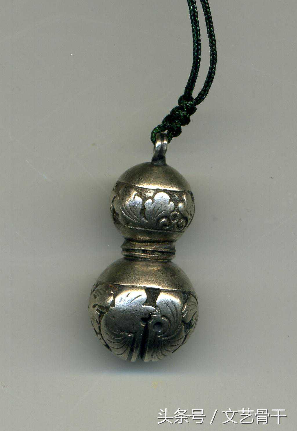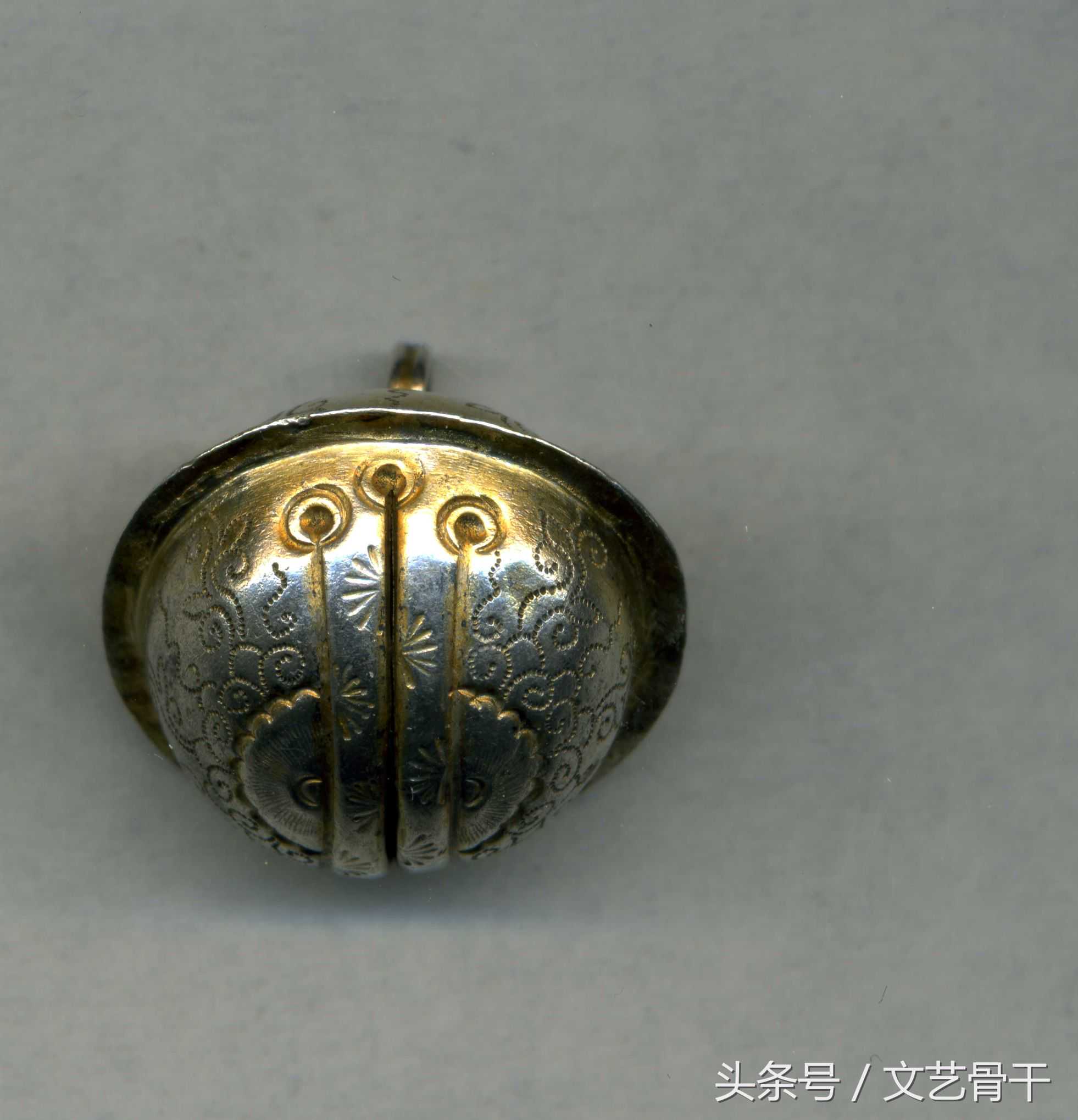 这是一个典型的葫芦形铃铛,虽然银质成色一般,但比之于上面的马铃铛形的铃铛,这个铃铛格外具有过渡性意义。上部是一个常规铃铛,下面的铃铛还有马铃铛的特征。这个铃铛甚至可以佐证银铃铛是由马铃铛演变而来的。上下两个铃铛的纹饰基本相同,上部是莲瓣纹的变体,下部是牡丹纹。两个铃铛焊接在一起,其制作工艺难度不大,但其实证意义比较大。
