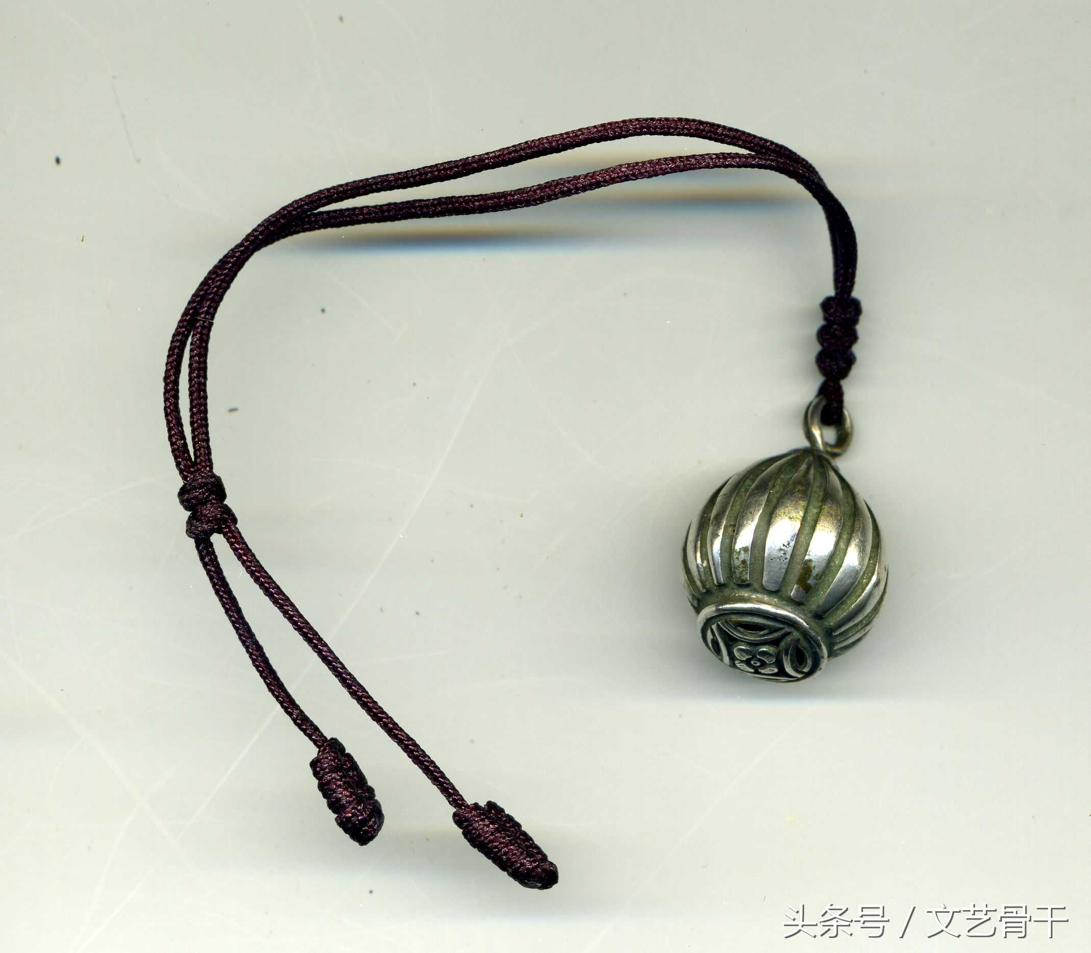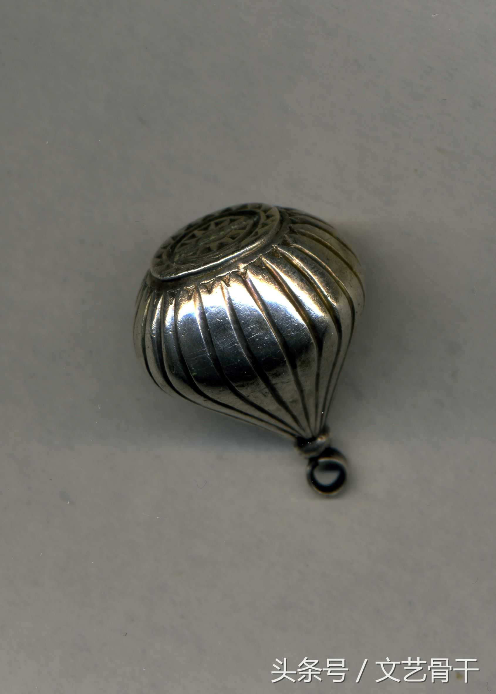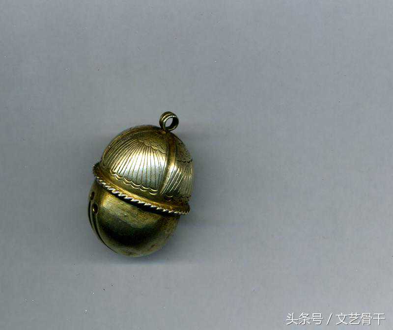 这是一个典型的葫芦形铃铛,虽然银质成色一般,但比之于上面的马铃铛形的铃铛,这个铃铛格外具有过渡性意义。上部是一个常规铃铛,下面的铃铛还有马铃铛的特征。这个铃铛甚至可以佐证银铃铛是由马铃铛演变而来的。上下两个铃铛的纹饰基本相同,上部是莲瓣纹的变体,下部是牡丹纹。两个铃铛焊接在一起,其制作工艺难度不大,但其实证意义比较大。