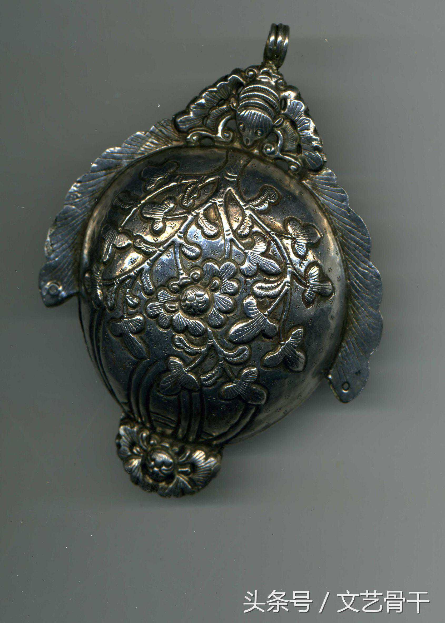 青蛙是我国少数民族崇敬的图腾之一,一般出现在云南、广西等地。但民族融合与文化交流使得少数民族地区的民俗文化也逐步融入我国其他省区。青蛙铃铛便是其中的代表。青蛙的生殖能力很强大,因此备受壮族等少数民族人民崇敬。其实很多民族的文化中都有浓重的生殖崇拜的印记。由于实物收集有限,我们对青蛙铃铛的研究还很有限。但从目前过眼过的青蛙铃铛来看,工艺水平参差不齐,精细者可谓极品,常规者则如上图。上图这件作品,铃声低沉,压模后,加刻纹路,以圈点在皮肤上勾画出简易的缠枝纹,背部錾刻“成人”二字。因此,可以推断,这是儿童佩戴的铃铛,应该属于长命锁的配饰之一。