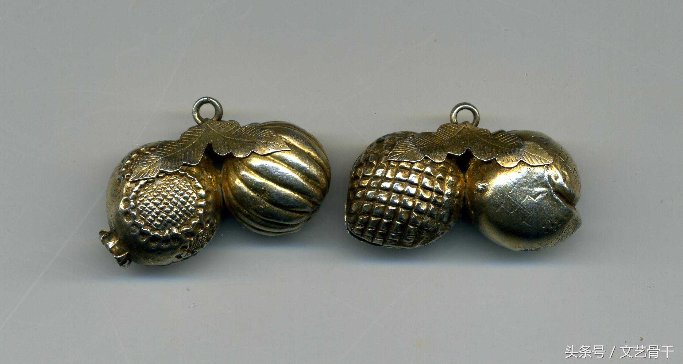 图18和图19为福建工的瓜果铃铛。这两个系列代表两种风格:一种是独立的瓜果铃铛,一种是组合式的瓜果铃铛。其中组合式比较珍贵,设计巧妙,寓意丰富。图18中的两对铃铛,每组两种水果,虽然已经焊接在一起,但为了增加牢固程度,又分别以树叶连接在一起,进而保证了两只结合在一起的铃铛能禁得住拉抻。树叶做得很有立体感,瓜果的鎏金也很具有福建特色,明丽而沉稳。四种水果中,最特别的是桃子,桃子上加刻了四个卐字。这使这件作品在具有浓郁的吉祥意味的同时,也具有了明显的佛教气息。图19的荔枝铃铛在我国其他省区比较少见,乃东南特产。