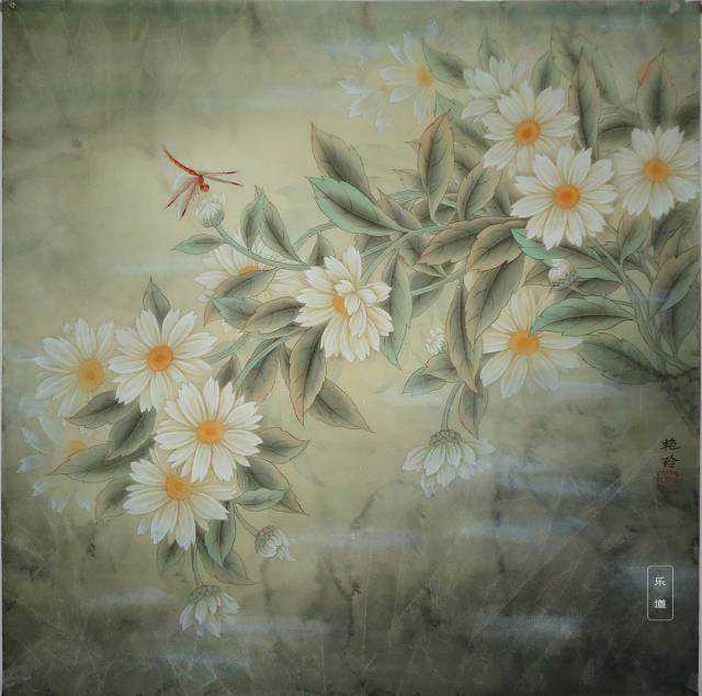 现代工笔常用肌理手法。在熟宣上先涂上某种颜色,在底色还没有干的时候趁湿润冲入别的色彩或清水或胶矾等。利用水和色的交融,产生一种斑驳无序的自然肌理美感。绘制老干、坡石等处常用。“撞粉法”、“洒盐法”所运用的原理皆和冲彩法类似。