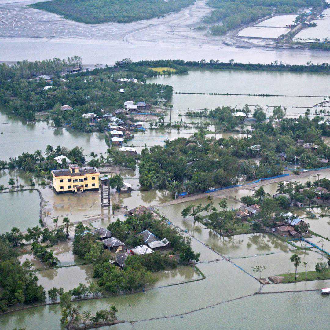 比如贾木纳河丰水期宽达12千米,旱季却可能仅有3千米宽,一旦上游降雨量过大,就会导致下游流量暴涨。河道排水不畅,河水容易漫过河岸形成洪水。此时常有飓风侵袭沿海地区,带来大量降雨,加剧洪涝灾害的灾情,让三角洲变成一片泽国。