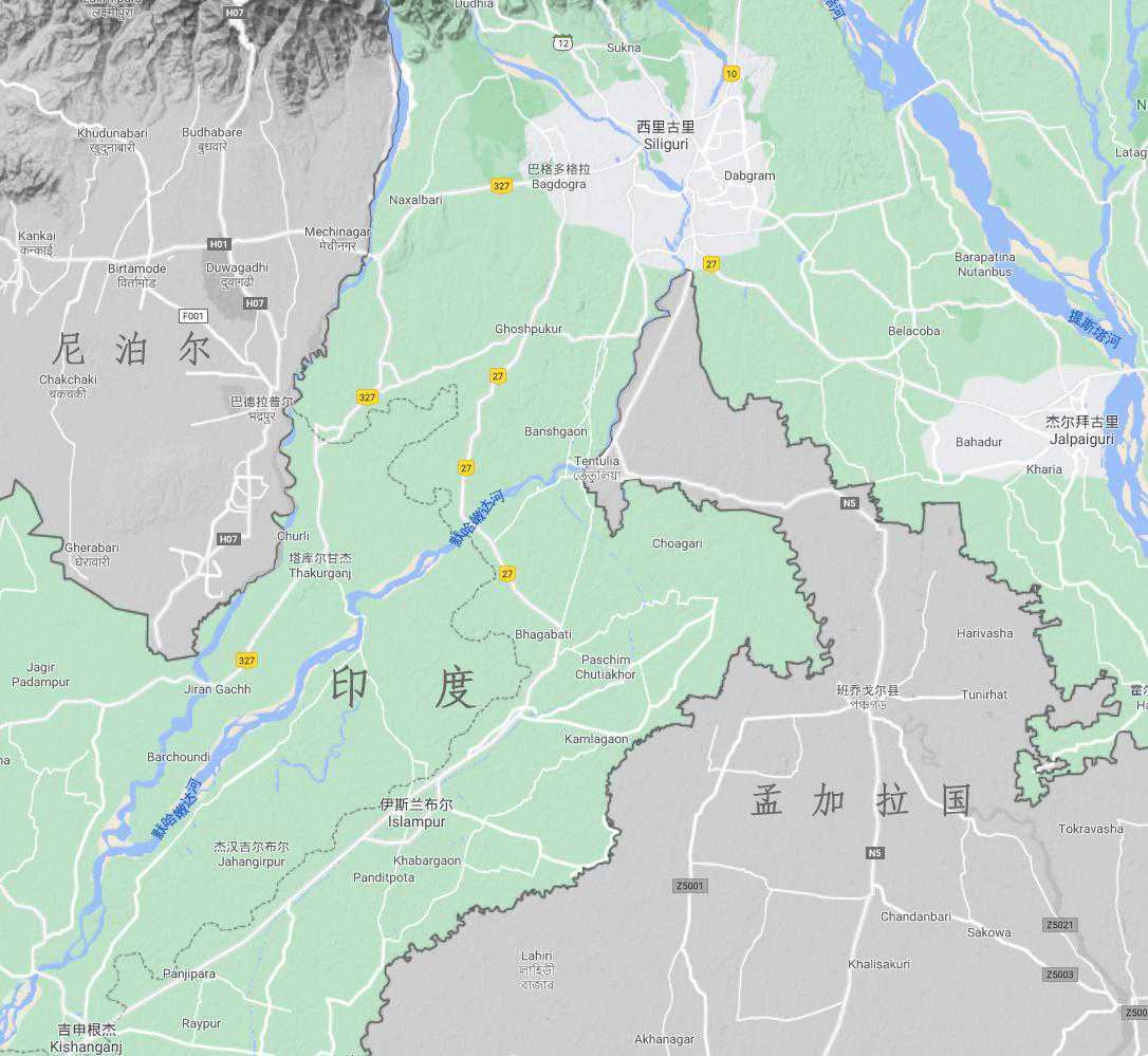 印度孟加拉边境的北侧,链接了印度领土主体部分与东部的西里古里走廊。这条走廊名副其实,仅仅有20公里宽的纵深,被戏称为印度的“鸡脖子”。一旦被切断,少数民族聚居的东部地区就变成了印度的飞地,保护领土完整的难度陡然上升。
