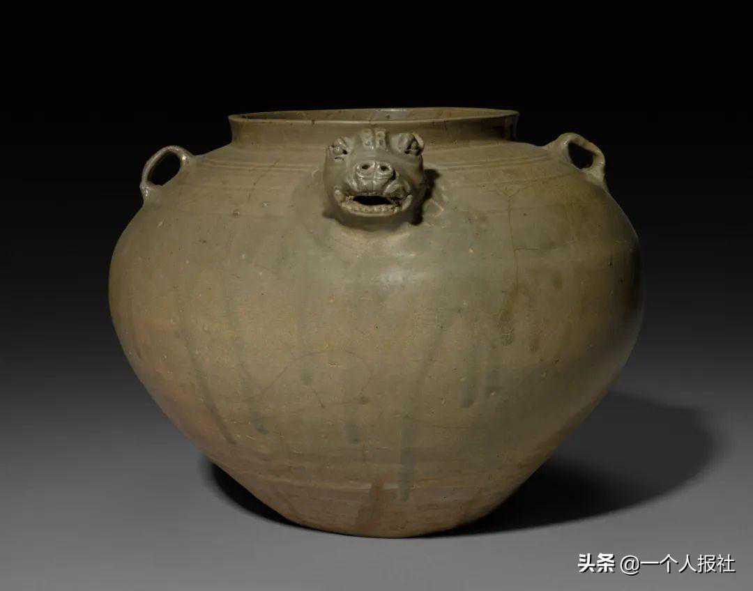 造型酷似青铜器,表面覆盖着一层薄薄的棕绿色釉。肩部三层纹饰中前两周为凤鸟纹,第三排的几何纹饰较为少见。早在商周时期(约公元前1600-256年),中国就有了高温烧造的带釉器物。随后陶工们获得了有关釉料中金属氧化物与窑气之间反应以改变釉料颜色的实用技术知识。