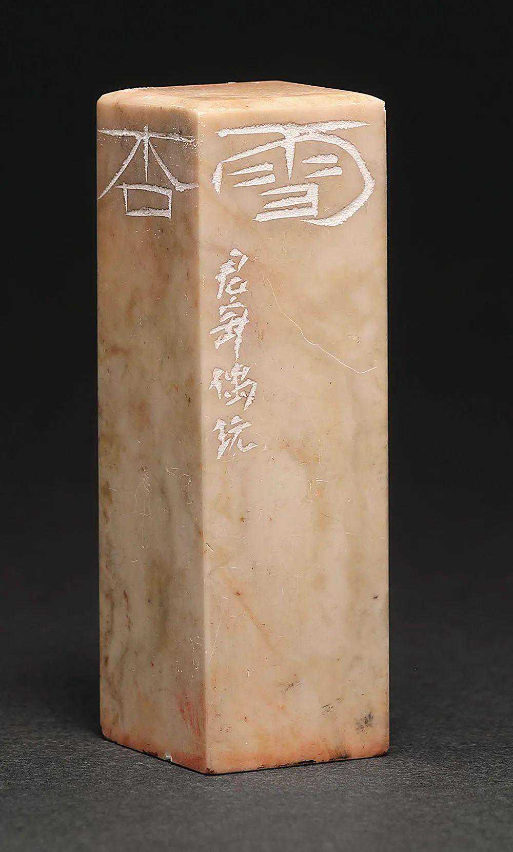 是印朱文,印面对称布局,雅洁清新,线条则方圆并济,意态生动,大字边款古拙,有汉隶自然变化。印文“杏花如雪”语出宋范成大《秦楼月·楼阴缺》,充盈着诗人浪漫。