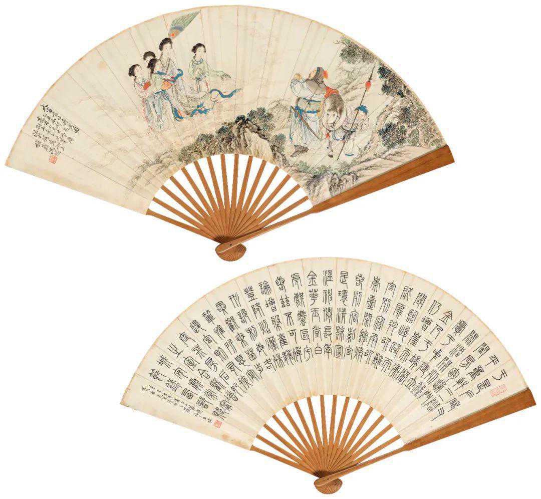 丁辅之是晚清著名藏书家“八千卷楼主人”丁松生从孙。其亦是西泠印社创始人之一,喜篆刻,殆有收罗,尤以西泠八家印作为多。此扇丁辅之写红梅、金文。其中红梅点点,枝干粗虬,墨色的晕染,亦是得宜,画面清雅脱俗。而金文则瘦而劲挺,齐整工丽。