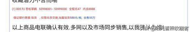 梱货十分罕见,近期有一个PL冠的苍松翠鹤梱货出现,因其品相好,号码无47且含8888好号,售价竟然高达55万元。下图