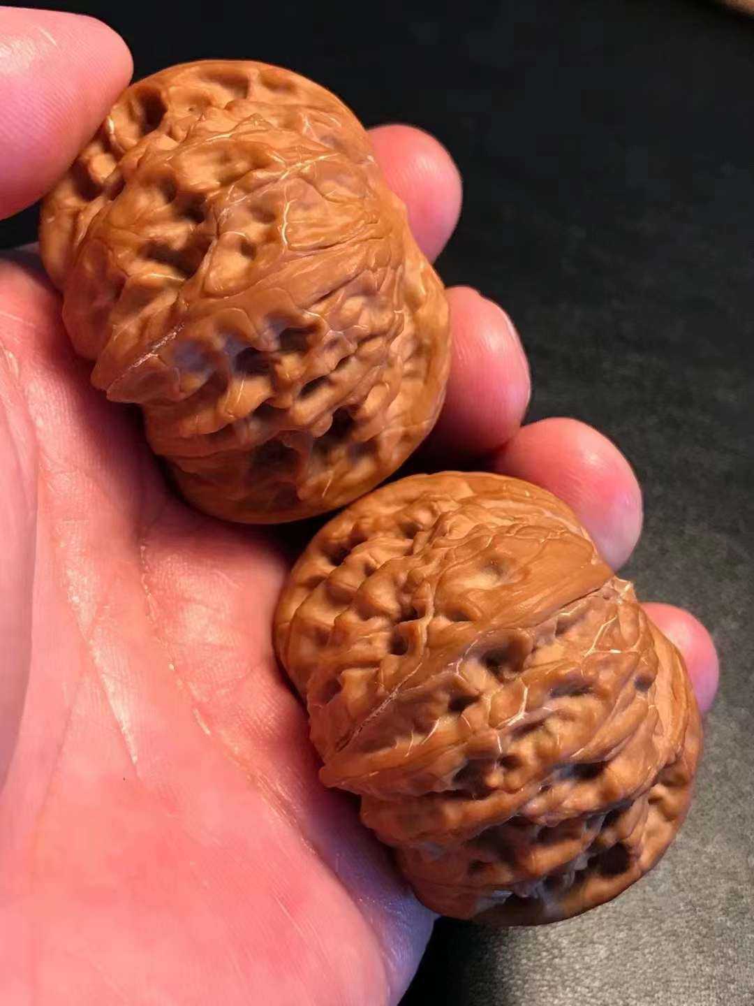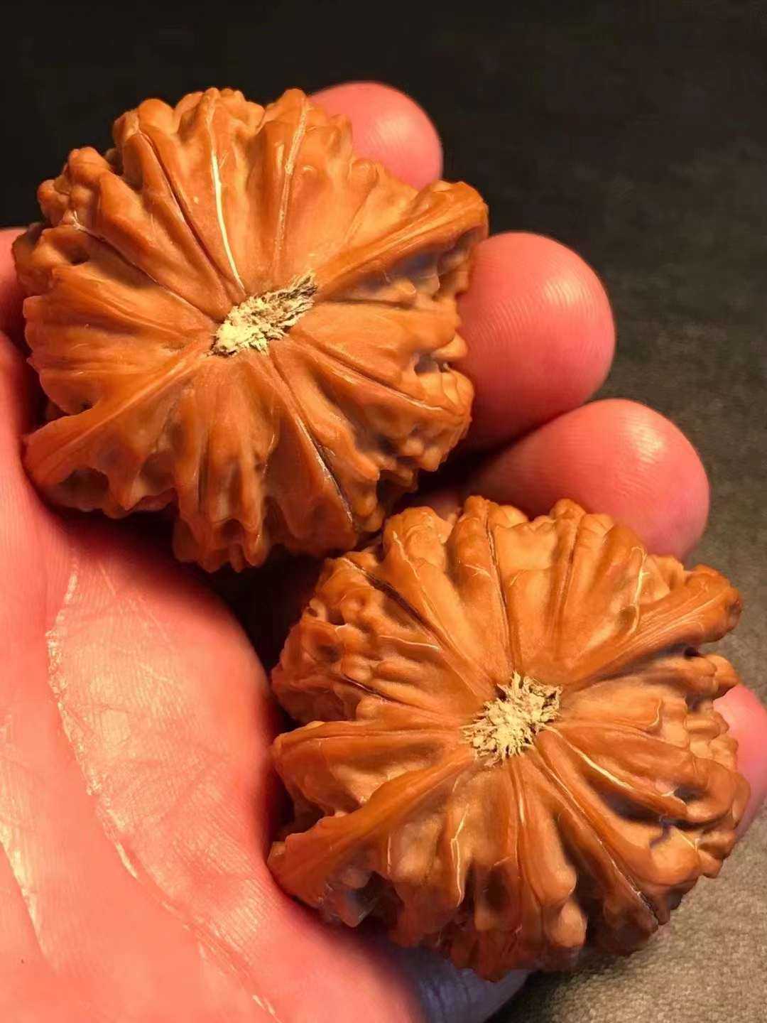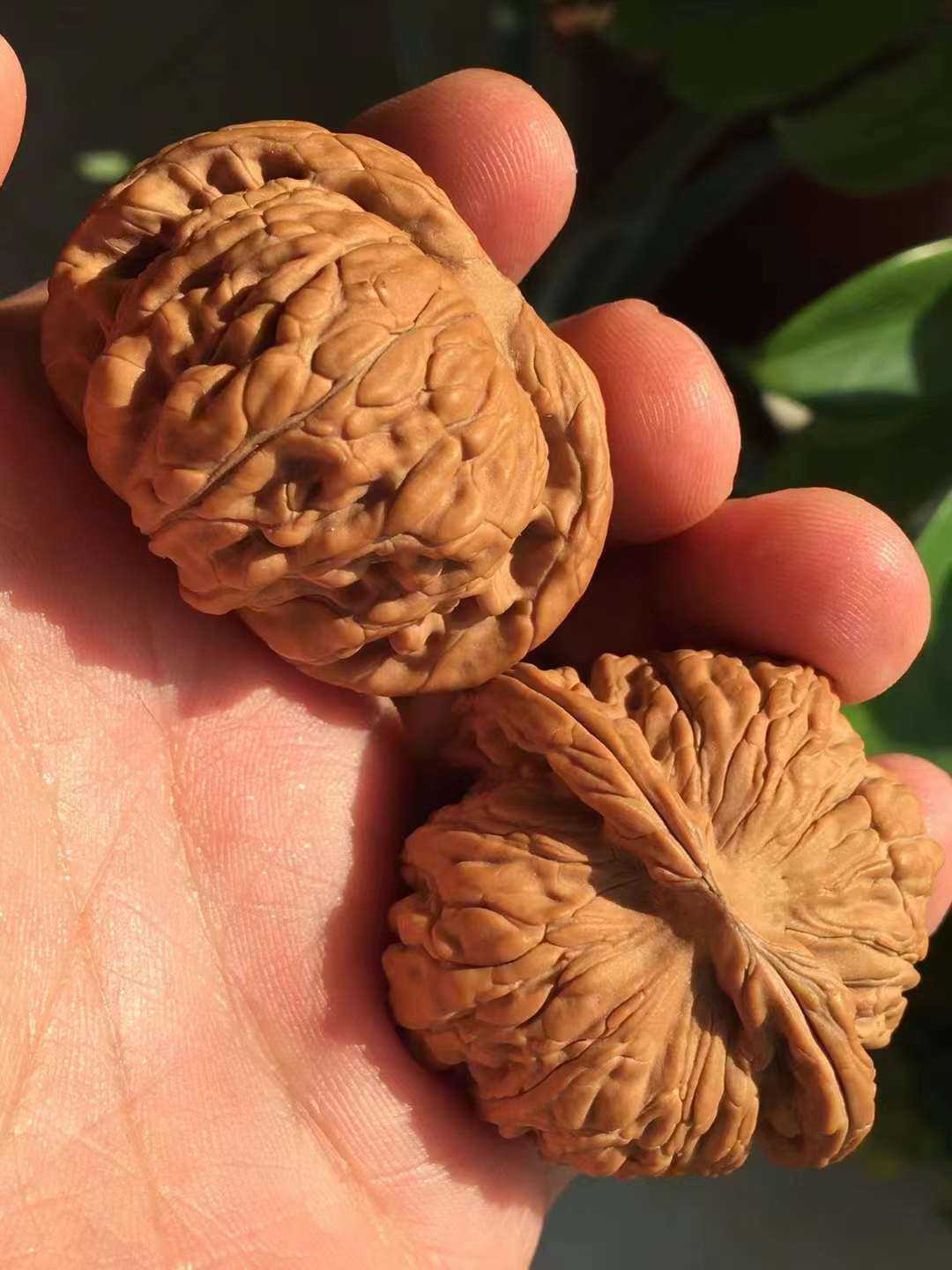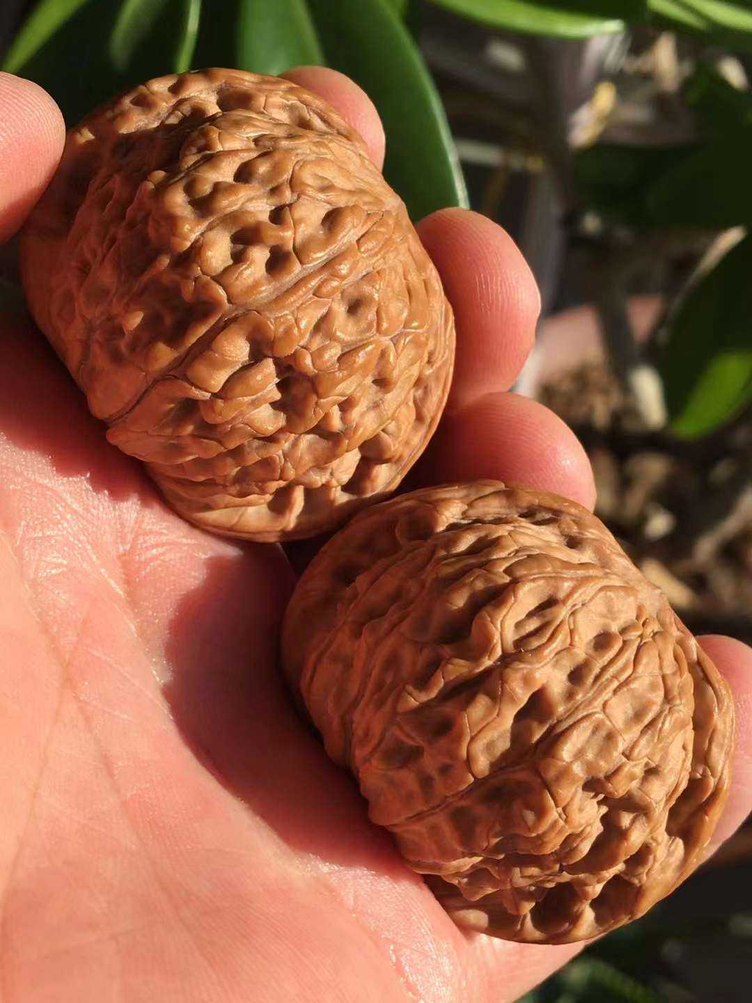 磨盘狮子头是文玩核桃里的珍贵品种,原产地在北京门头沟妙峰山。老树只有这一棵,树龄达百年以上,目前仍存活。这棵野生老树上的磨盘果子尺寸不大、挂果率也越来越少。不过器型比现在嫁接树的更加饱满,主筋更加粗壮,视觉和手感上更胜一筹,这或许也就是乾隆喜欢磨盘这个品种的原因,也是真正意义上的乾隆磨吧!
