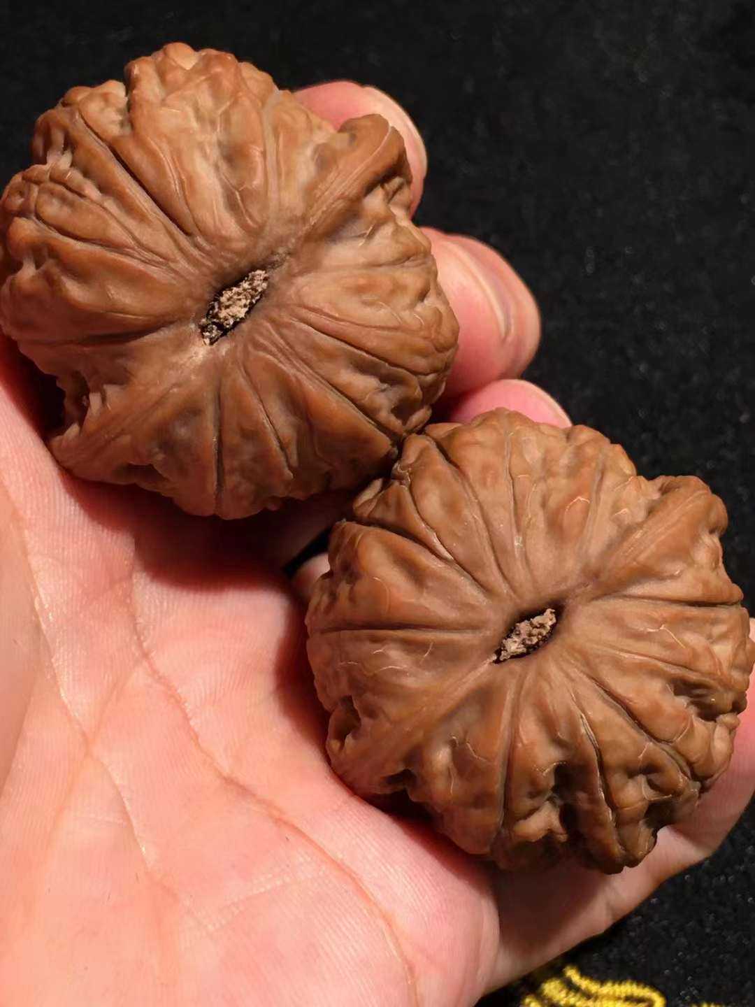 乾隆的文玩核桃藏品中,就数磨盘最多,不过那时候还不叫磨盘,叫闷尖狮子头。此果儿形状较矮,边厚且宽,纹路浅大平底,核尖为山字形。两个核桃摞起来后形似磨盘而被后人更名为磨盘狮子头。