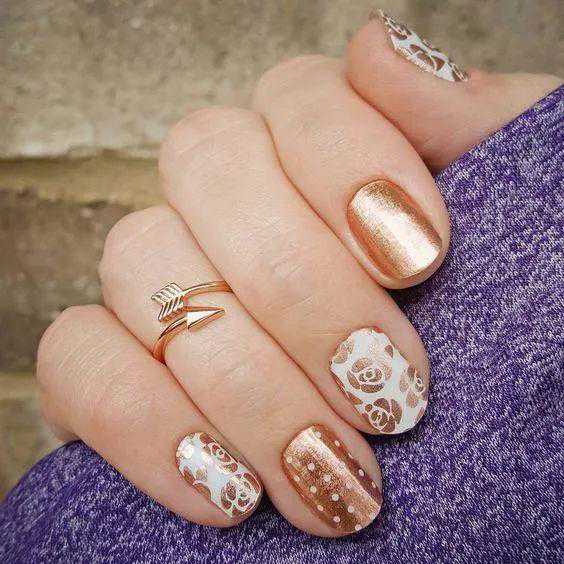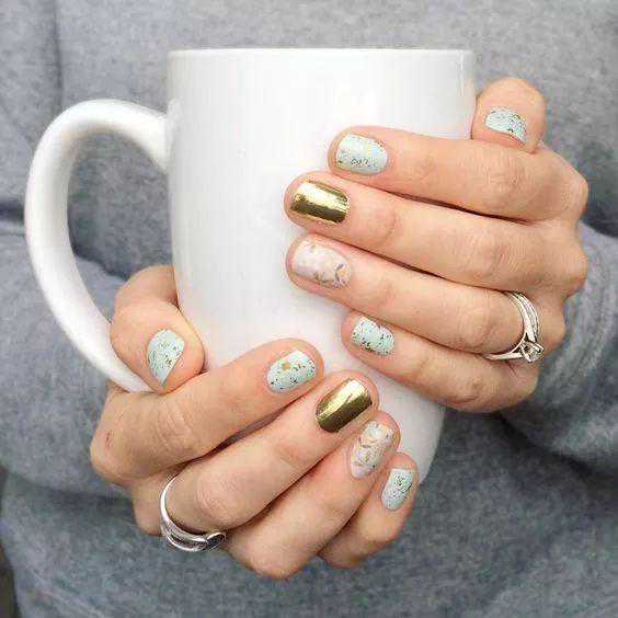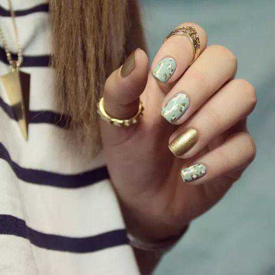 说到金属美甲,当然少不了金色带闪的加持和点缀。尤其对于越来越独立的都市女性来说,几何图形更显利落和洒脱,更适合和金色搭配呈现。