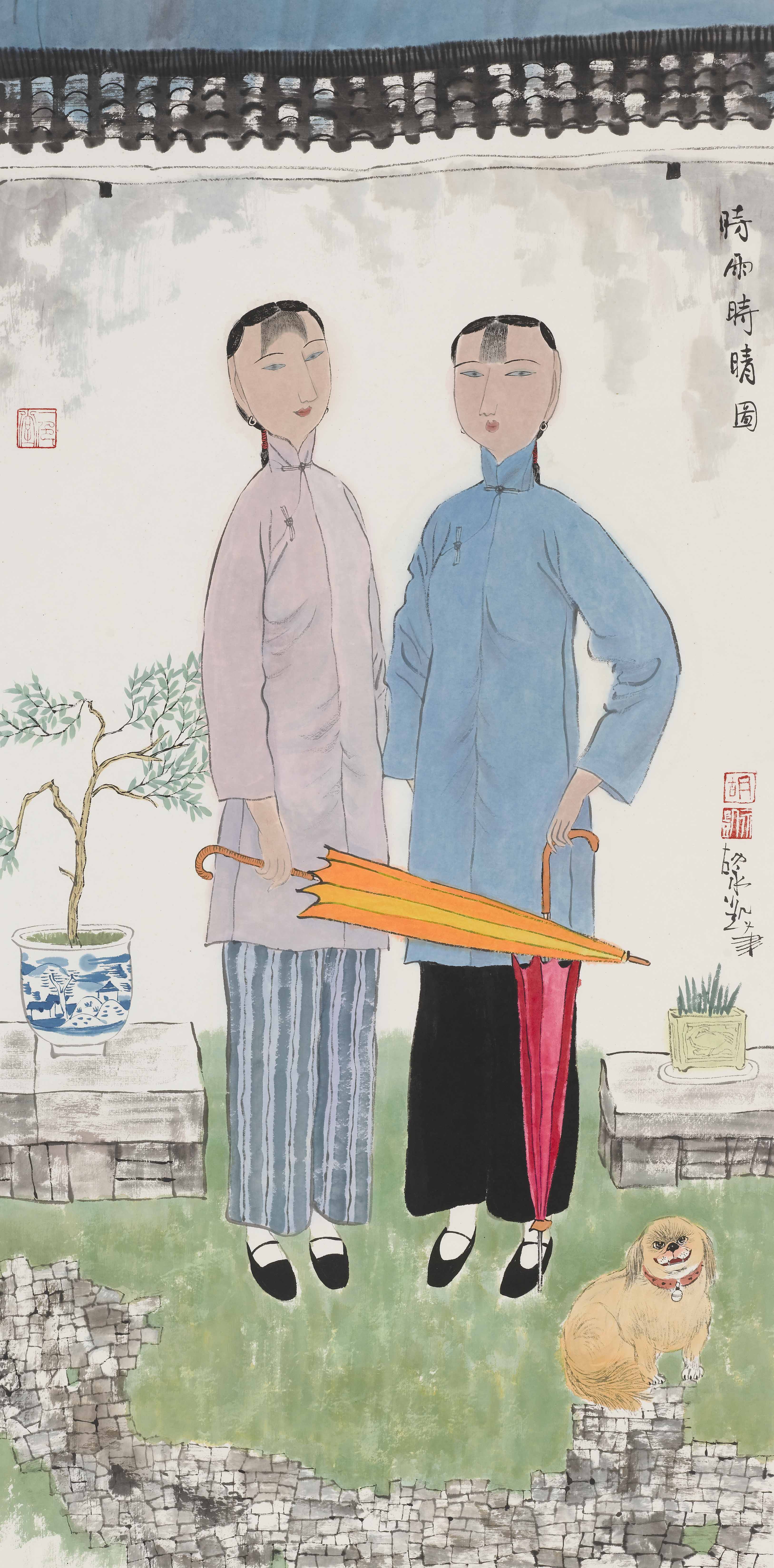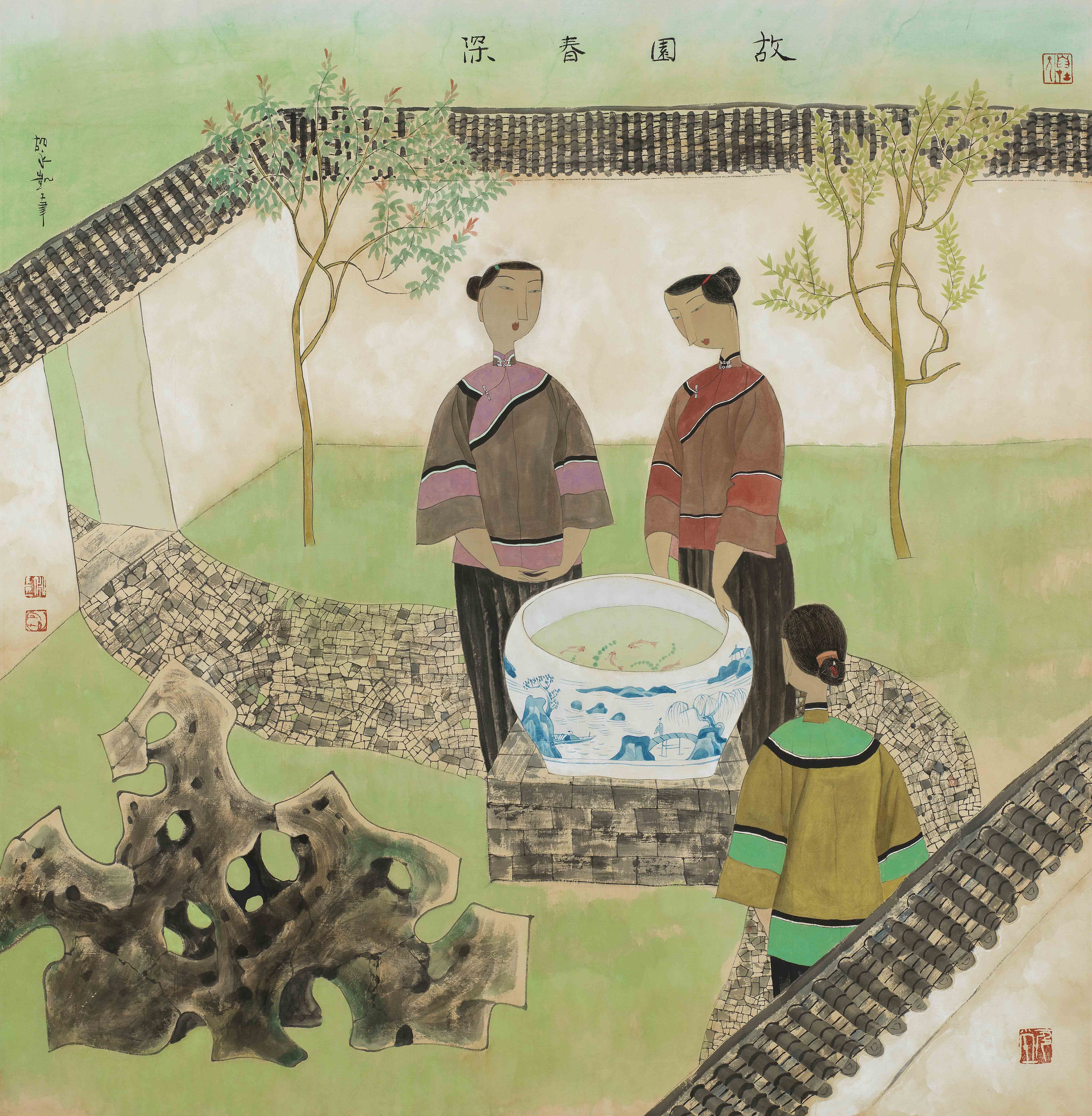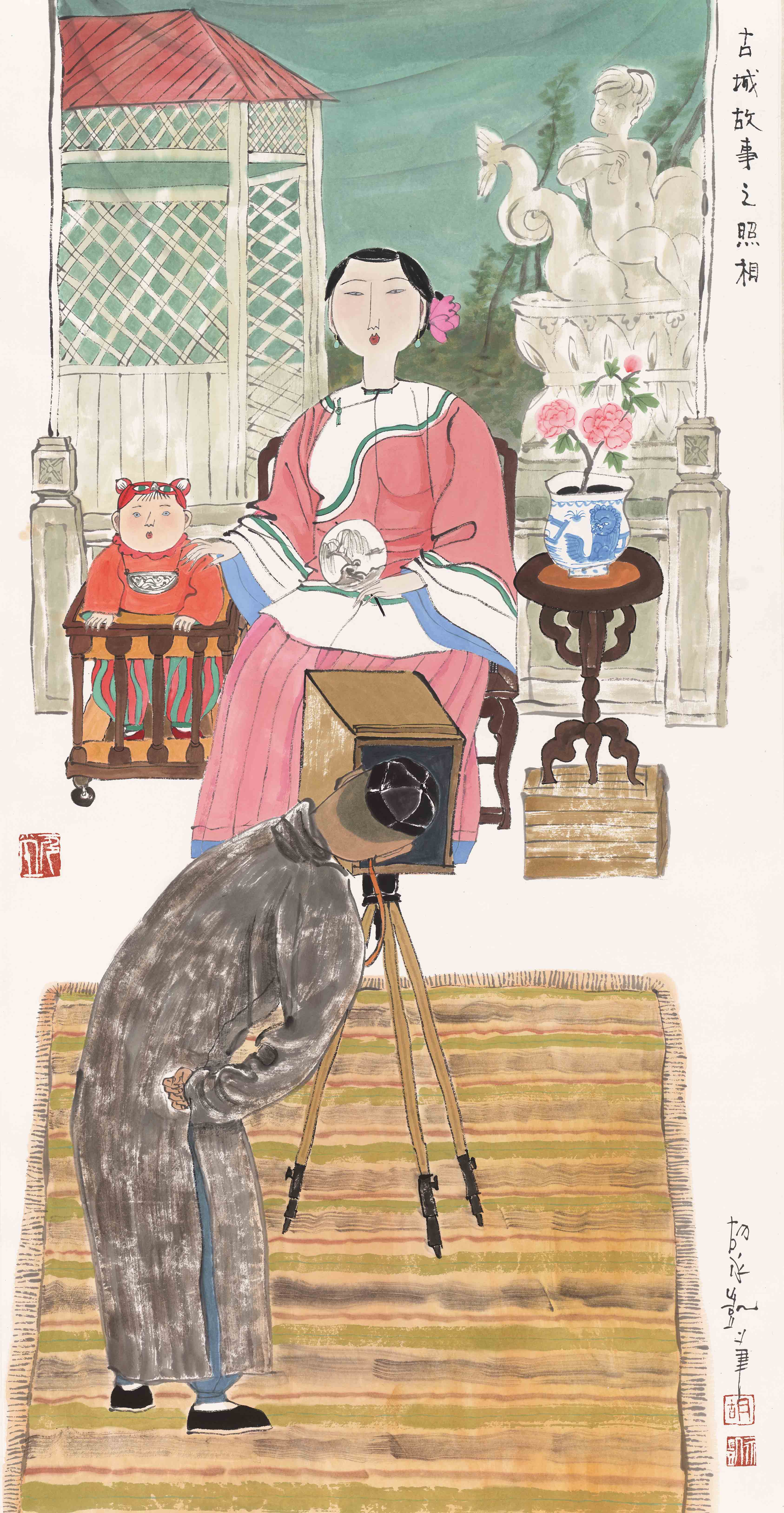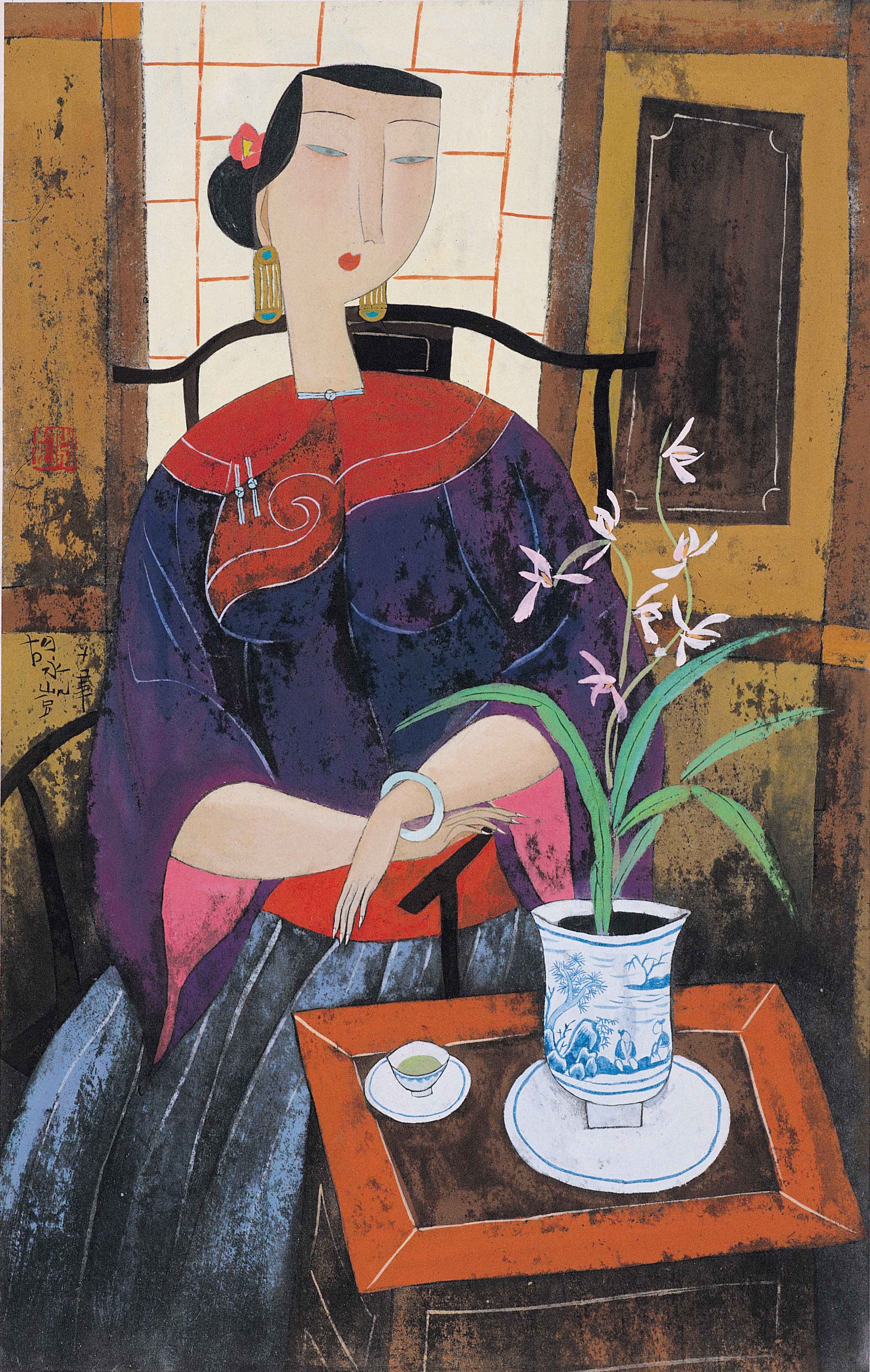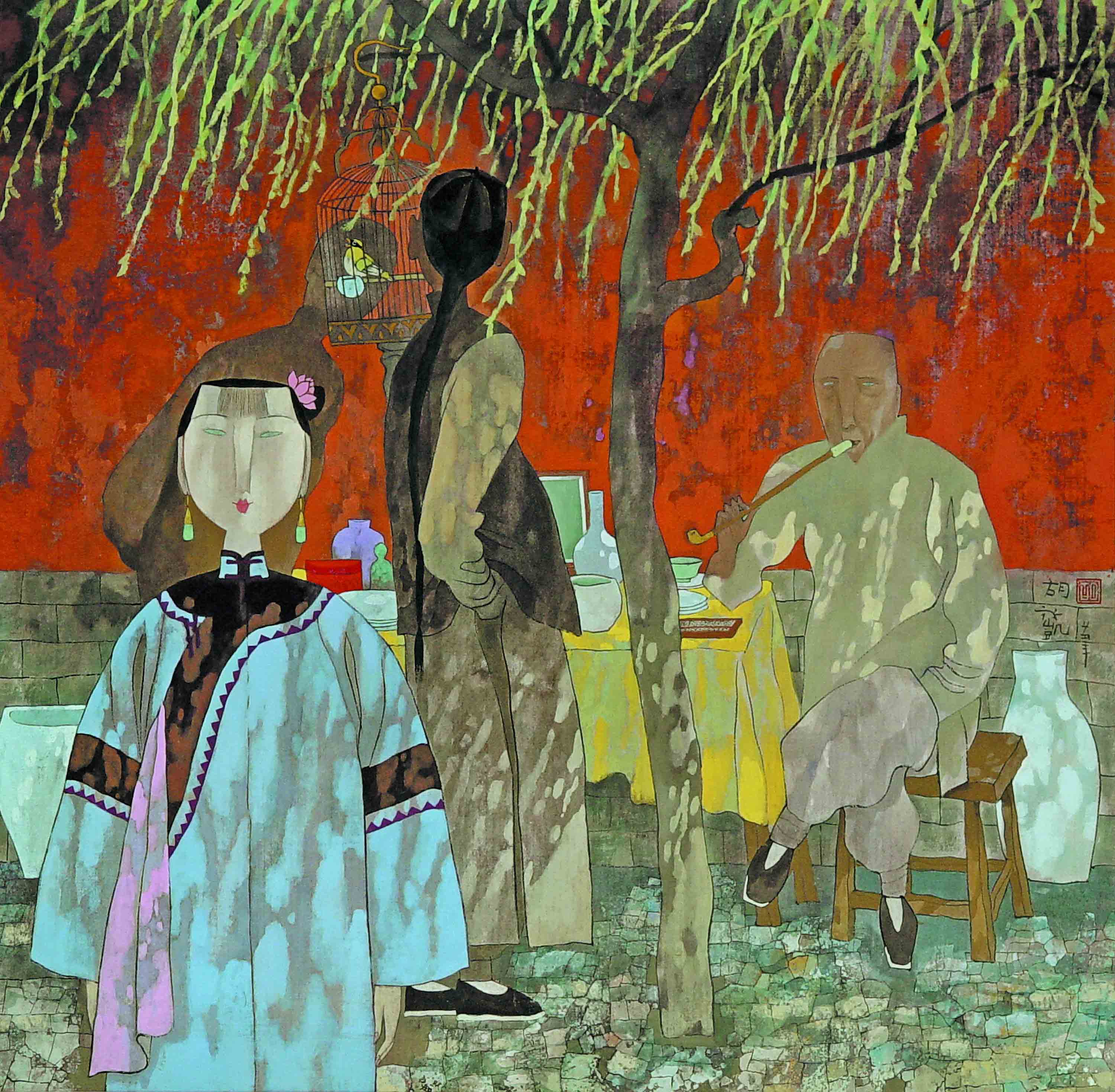 胡永凯作品有一股浓浓的怀旧意味,他笔下的“旗袍女人”可以说填补了中国女性题材绘画史中缺失的一页。众所周知,中国的“仕女图”一般都是“古装”为主,作品中人物的着装都是明代或以前的,这似乎已是约定俗成,而1949年以后,表现“工农兵”形象的作品成为主流,这就造成清末到民国的这一段历史的女性形象几成空白。胡永凯在创作这些作品的时候,充分展现了他全面的学养;有对沉积历史的细致品味,有对形体美的独到发掘,有对传统笔墨的全新把握,有对中国画色彩的不懈探索……他的艺术表现不同于前人,但又实实在在是从传统中生发出来的。