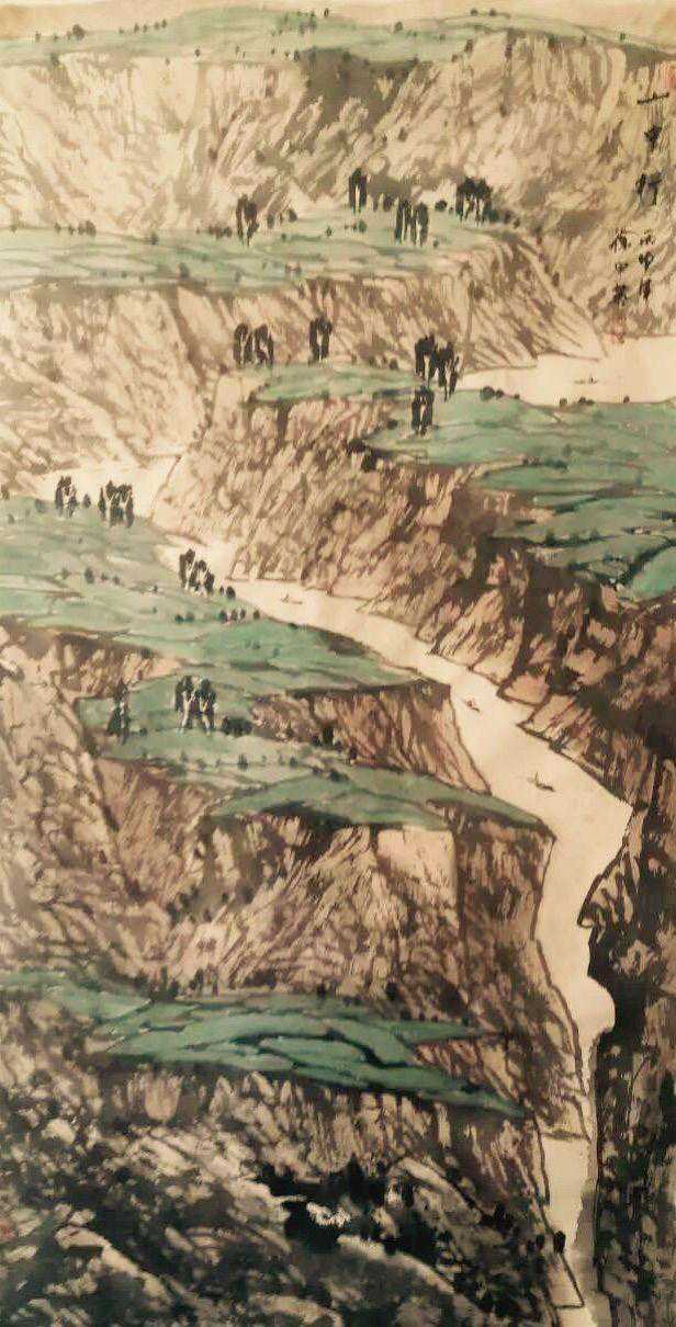 不论是《争流》的千帆竞渡;还是《草色野意》狂放;不论是《夏山苍翠》欲滴涌;还是《闾山》的莽莾苍苍;你又可在《老家》画卷中感受乡愁是心中一滴硕大的热泪;家乡是一颗根植灵魂大树,是缠绵思念中孵出的月亮,是远行脚步下绵延起伏的群山。是坎坷时刻,萦绕在耳边唇际不休地阵阵春风,搀杂着发梢、麦秸、炊烟和母亲的乳香、父亲的辣辣的煙味;是枕边汗湿的一袋故土,在梦里缭绕不散的云霞。如今虽已住进了城市的高楼,可总觉得这不是家,只是个像家的客栈,因为你知道母亲还在老家等你,老家的山水还在呼唤你的乳名,你多么想在大山中唱那首山歌,打一捆上好的柴,为父母点燃灶火,让袅袅炊烟温暖老家的冬天。