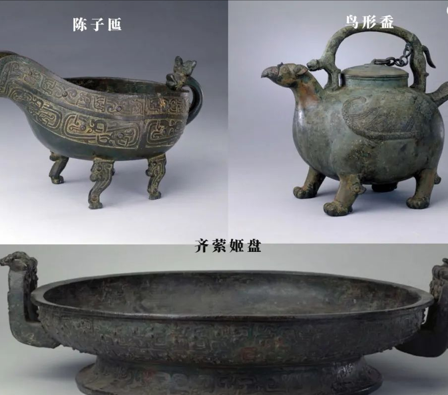 陈子”与“齐萦姬”均为器皿上所刻铭文,代表所属关系;齐萦姬盘为春秋后期器物,陈子匜、鸟形盉年代不详