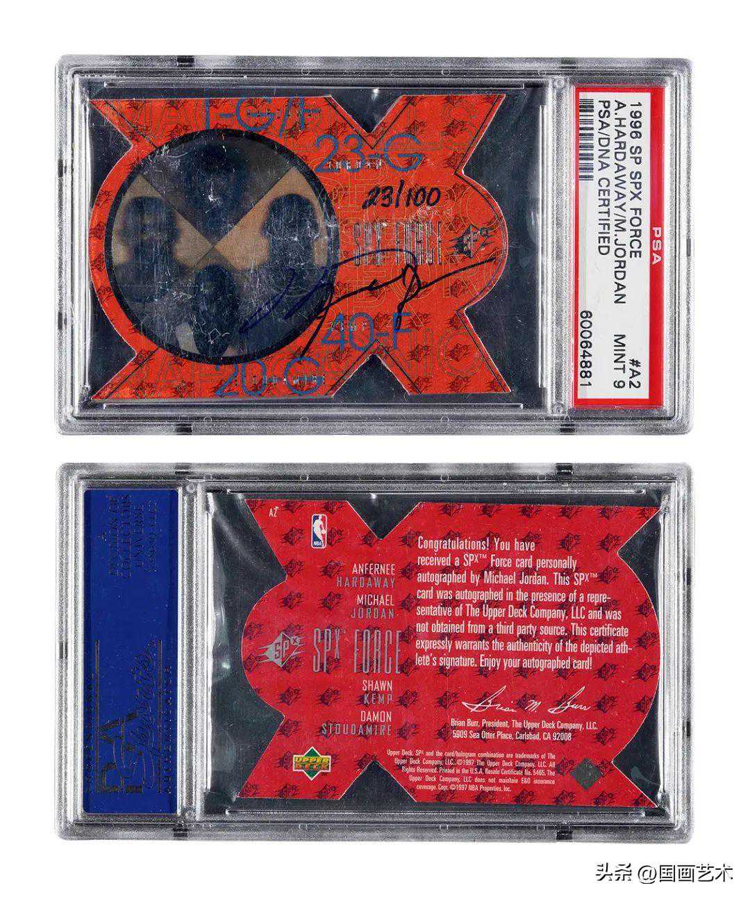 此拍品为1996-97赛季UpperDeck公司发行的SPSPxForce产品中,迈克尔·乔丹(MichaelJordan)、安芬尼·哈达威(AnferneeHardaway)、肖恩·坎普(Shawnkemp)及达蒙·斯塔德迈尔(DamonStoudamire)四人镭射特卡并由乔丹完成亲笔签字,该版本是乔丹最早期的签字球星卡之一,全球限量100张,并且此张为限量第23张,与乔丹身穿球衣号码相同,是100张中最具有收藏价值的一张,经由PSA评级,品相9分。