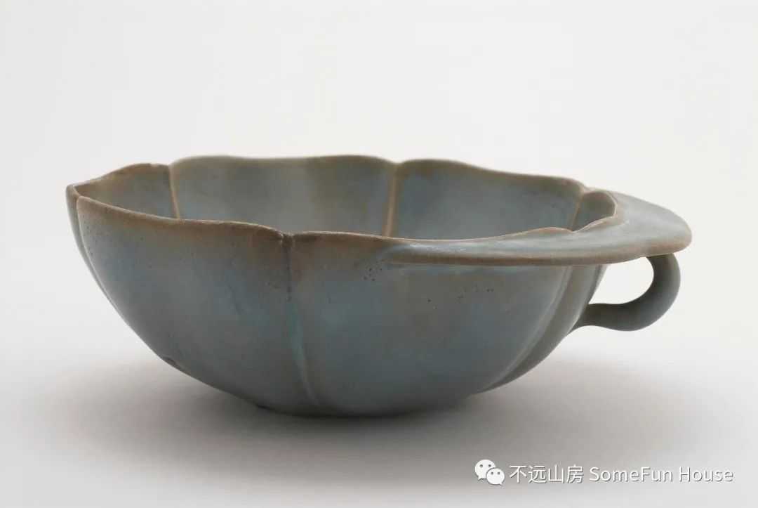 河南博物院藏金代钧窑月白釉荷叶形单柄杯,金代,高5.9厘米,口径17厘米,1980年嵩县城关镇北街砖厂出土。体呈6瓣荷叶式,口部微敛。口部一侧出葵式折沿,沿下附耳,耳与腹部相连。通体施月白釉,满釉支烧,底部有三支烧痕。