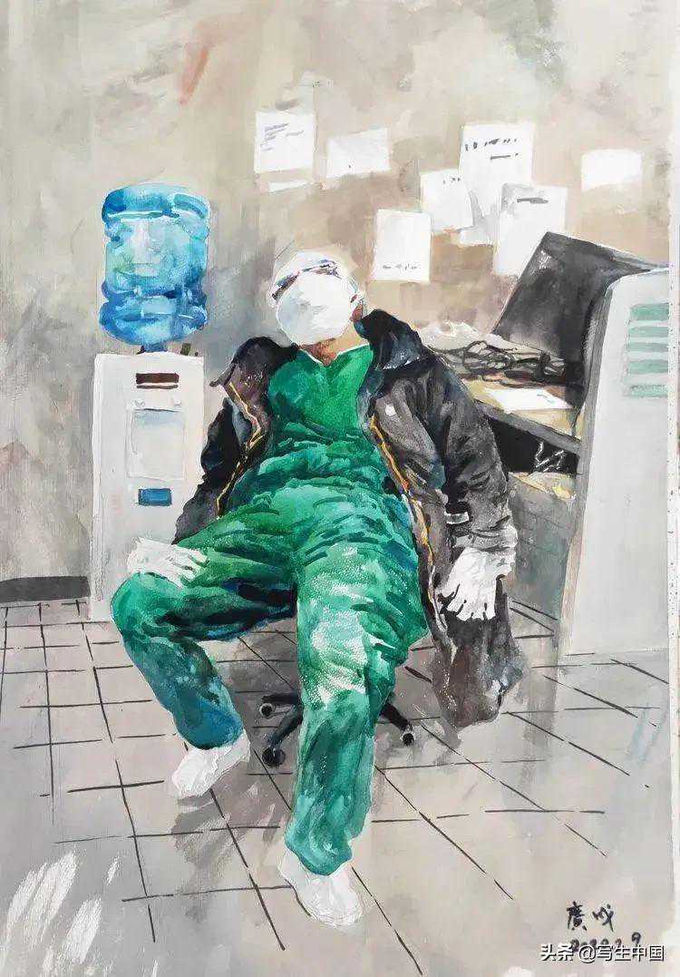 《致敬抗疫一线疲惫的女护士》水彩19x26cm陈沛