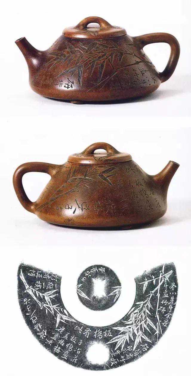 他请邓奎到宜兴监造,而他则亲自操刀镌刻,与曼生不同的是,他不仅在壶上刻铭文且把他最得意的竹子锓于壶上,俯仰疏密、一如其画;并大胆尝试,在壶盖上装饰,竹枝从壶身延展到壶盖,遮天蔽日,别具匠心。