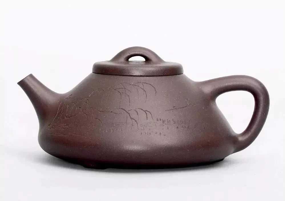 壶身一侧,刻有烟波浩渺,垂柳数条,一艘小舟荡漾水上,虽无笔墨点染皴擦,却深得风骨,寥寥几笔,写意传神。