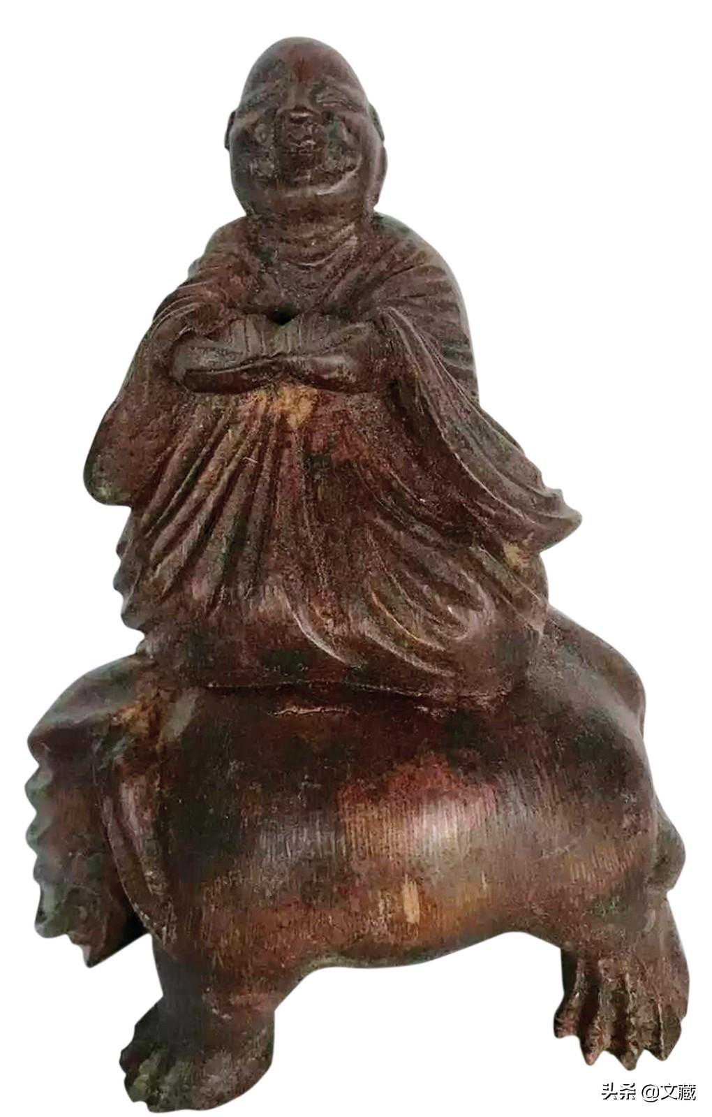 此为骑象罗汉圆雕,为明代物。一般视手工细密为佳的见解,实多误区。精细而雅,与精细而俗,即有云泥之别。同样,以工之细粗定优劣亦欠妥,粗简见拙,拙中见匠心者则优,粗率潦草,毫无艺趣者为劣。故不能仅从表象之粗细作定论。且精细过甚则繁琐小巧,而粗简宏博则洗练大器。粗细精粗乃表象也,得其神采者艺心也。视此戆拙可掬的圆雕,神采存也。上海话里有“戆大”一说,戆则大,大则充实,充实之为美。此雕得之矣。