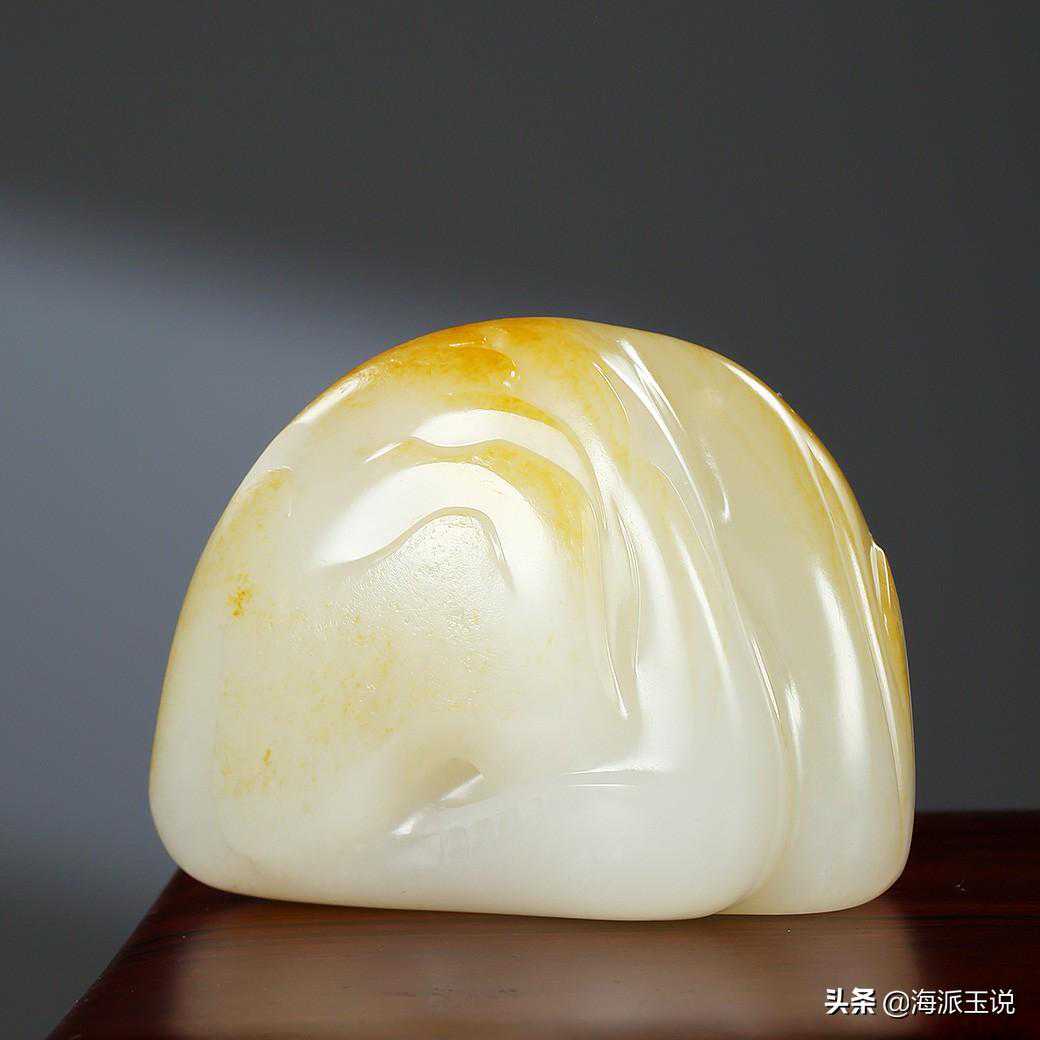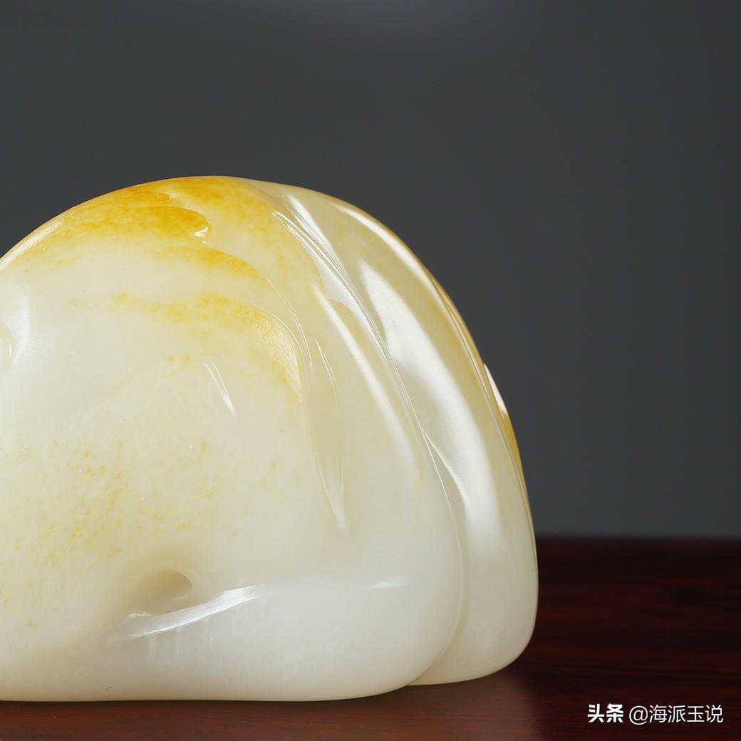 这件作品由和田玉籽料雕就,作者最大限度地保留了玉料的天然外形,圆润饱满,毛孔自然,并带有洒金皮色,使得在润美玉质之中,又平添了不少富贵之色。